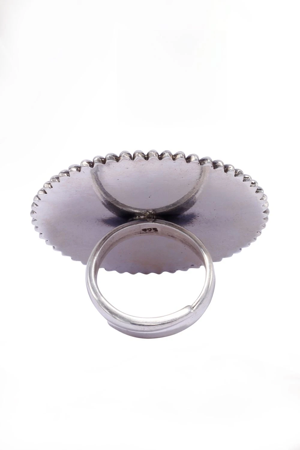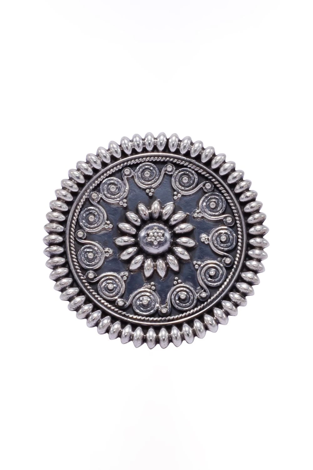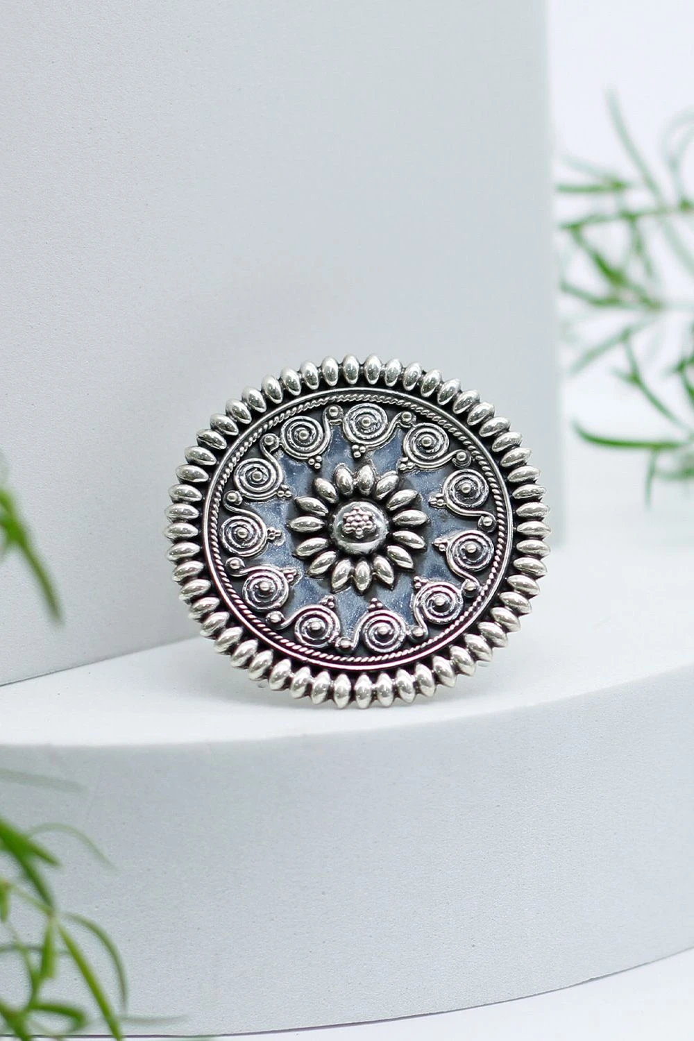 Complete your ensemble with elegance by adorning this exquisite round silver ring. The handmade floral pattern highlights its beauty, adding the perfect finishing touch to your sophisticated look.