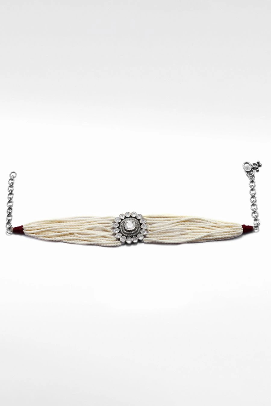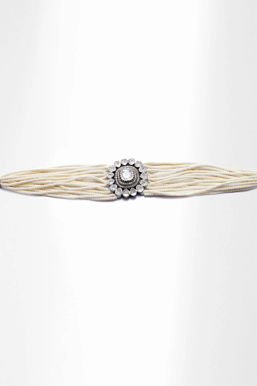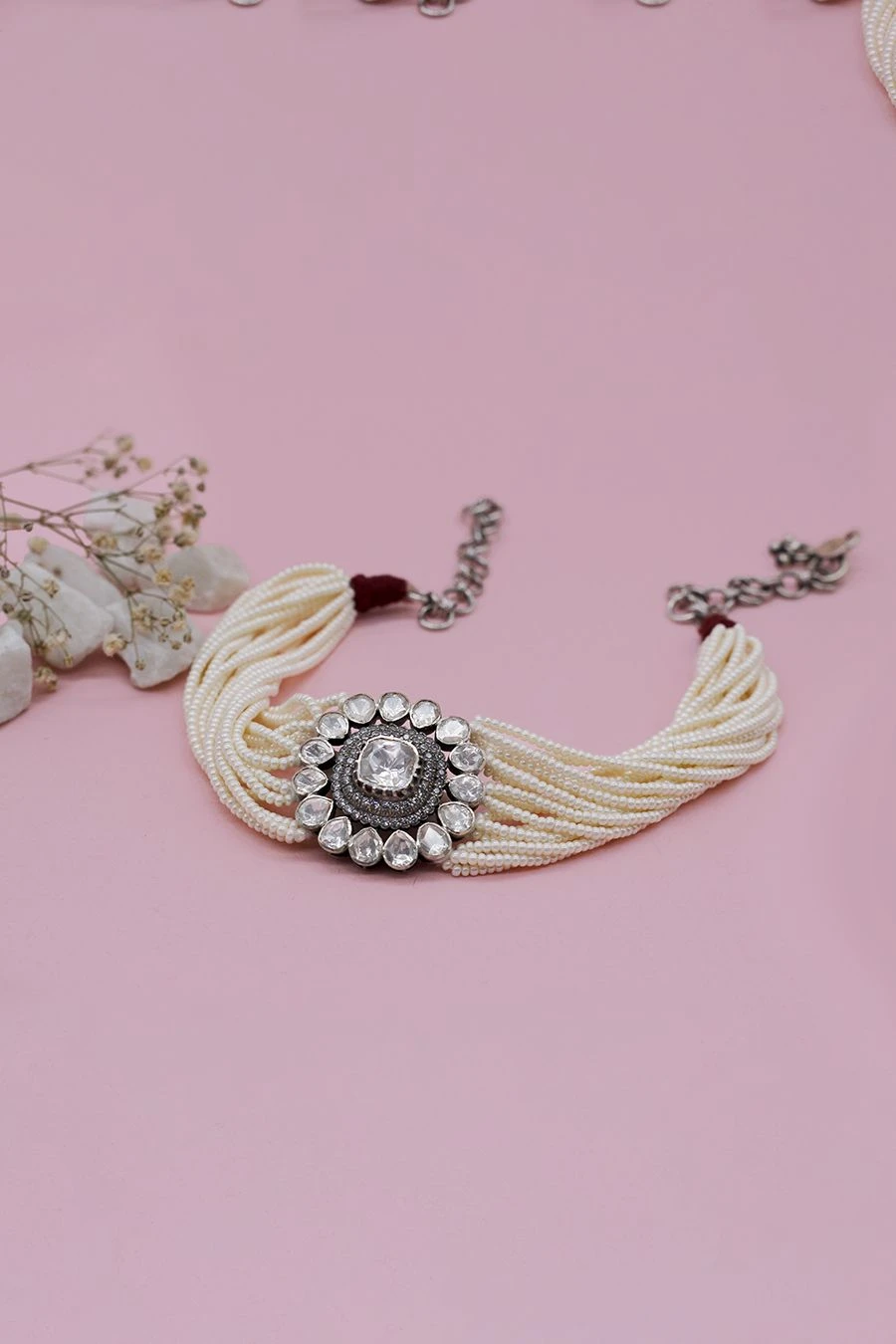 This chic handcrafted silver necklace is the perfect accessory to style with your daytime looks. This silver choker is crafted with pearl beads and studded with moissanite gemstones.