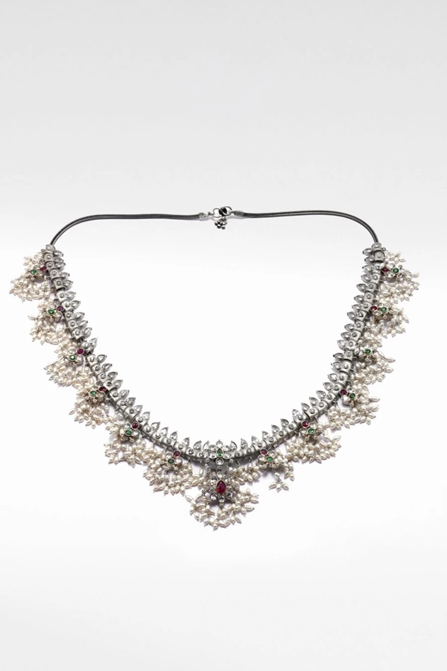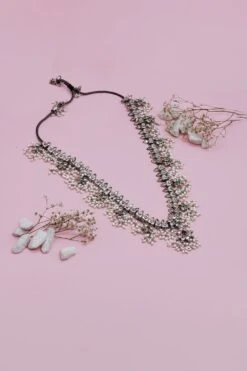 This chic handcrafted silver necklace is the perfect accessory to style with your daytime looks. This necklace is handcrafted in silver and studded with multicoloured gemstones.