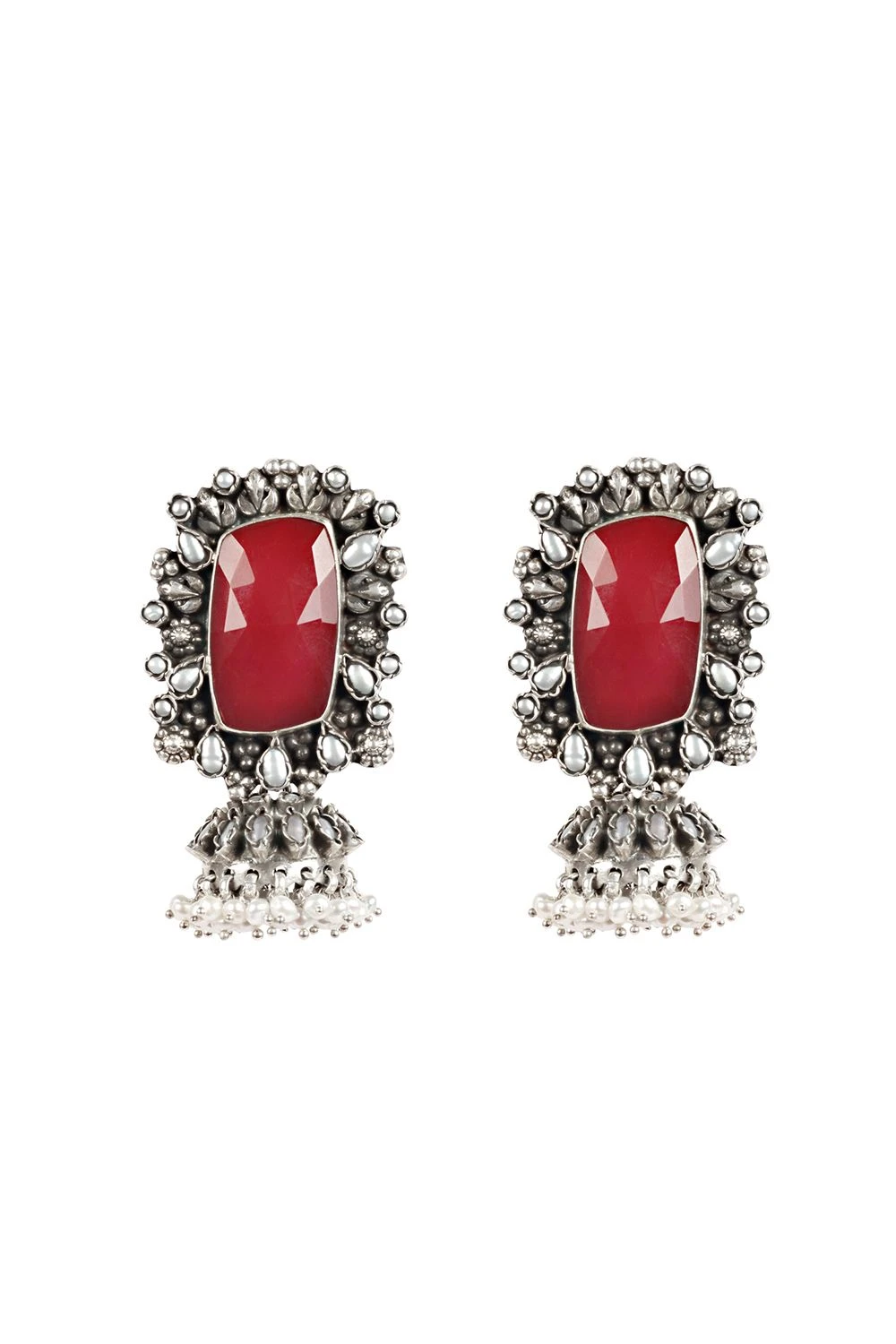 Uplift your minimal looks with these striking silver earrings accented with bold red onyx stone & pearl drops. You can style these with a neutral tone tunic or kaftan for a pop of colour.