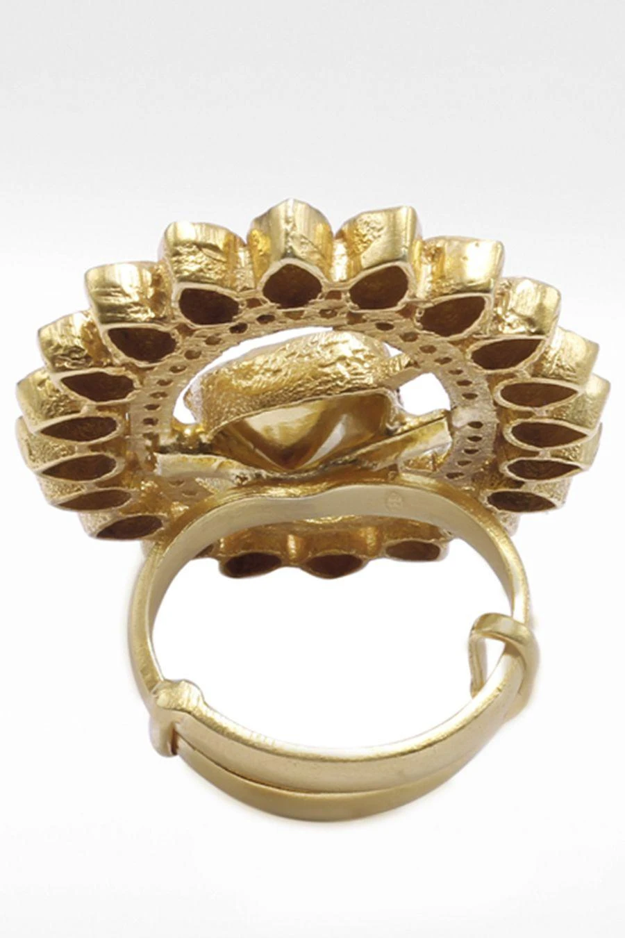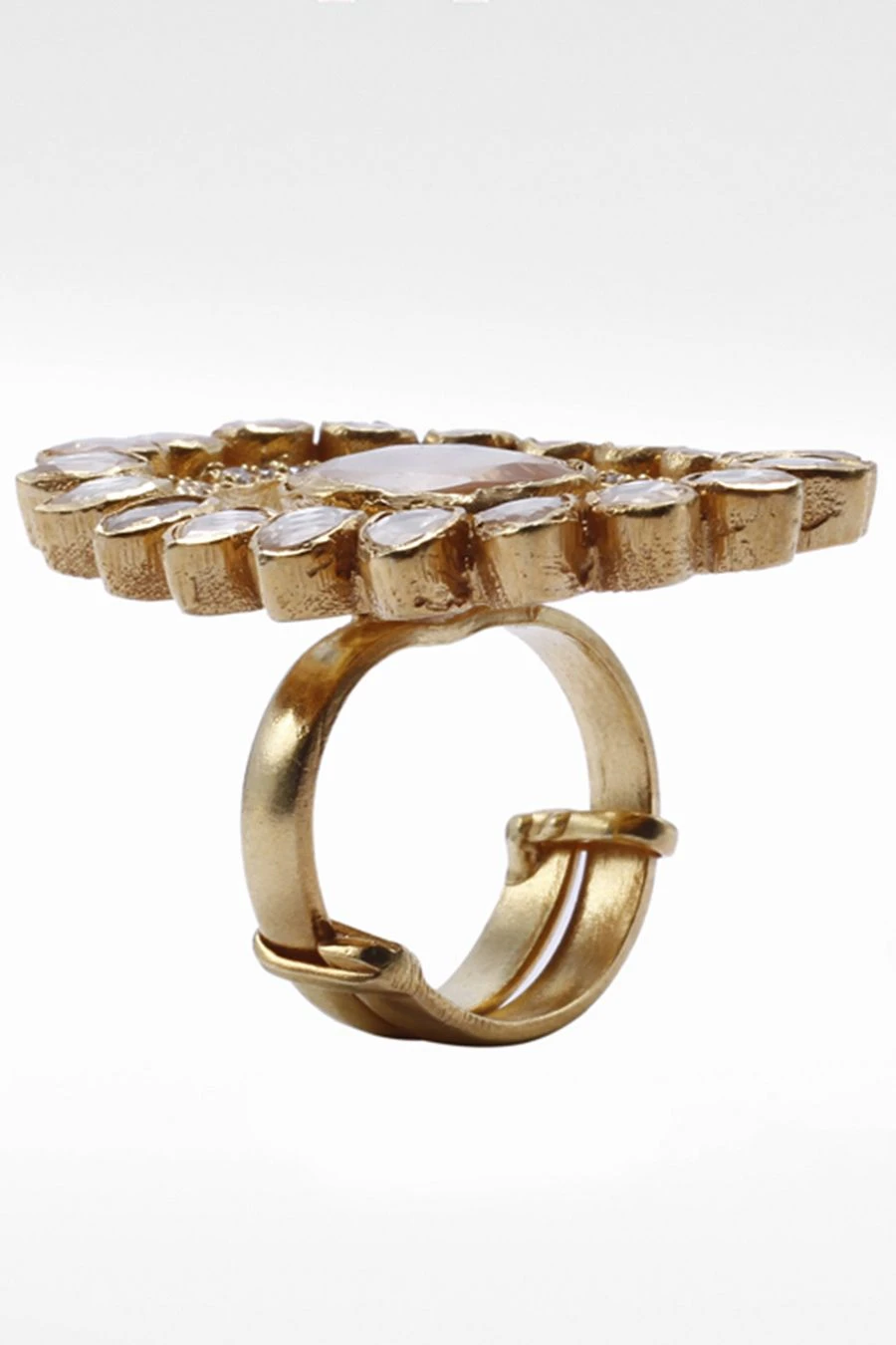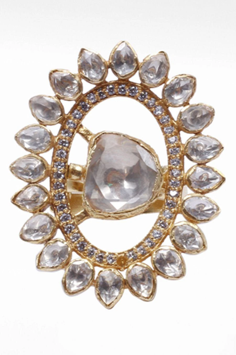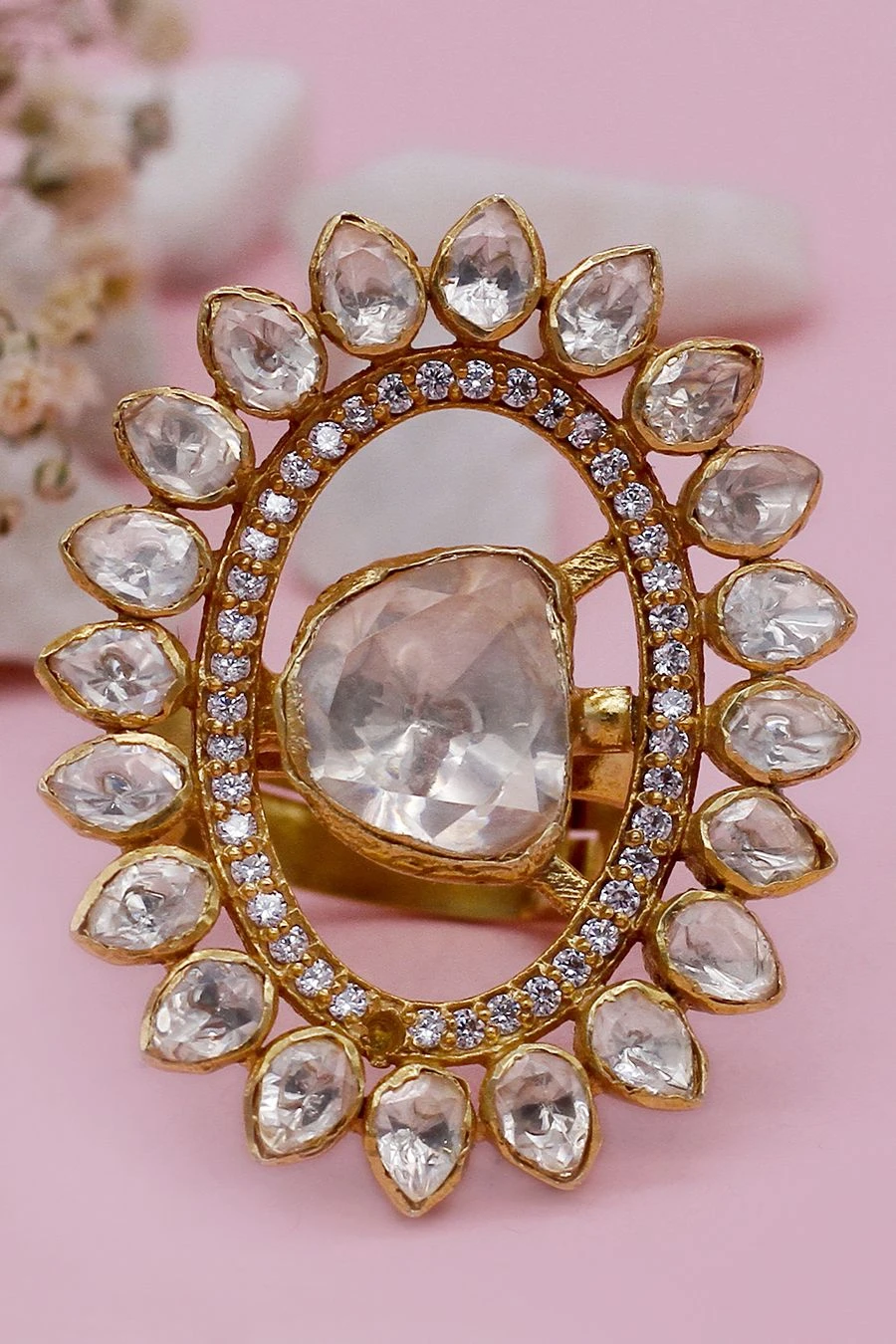 This chic handcrafted silver ring is the perfect accessory to style with your daytime looks. While demonstrating exceptional craftsmanship, this 24K gold plated silver ring is studded with moissanite gemstones.