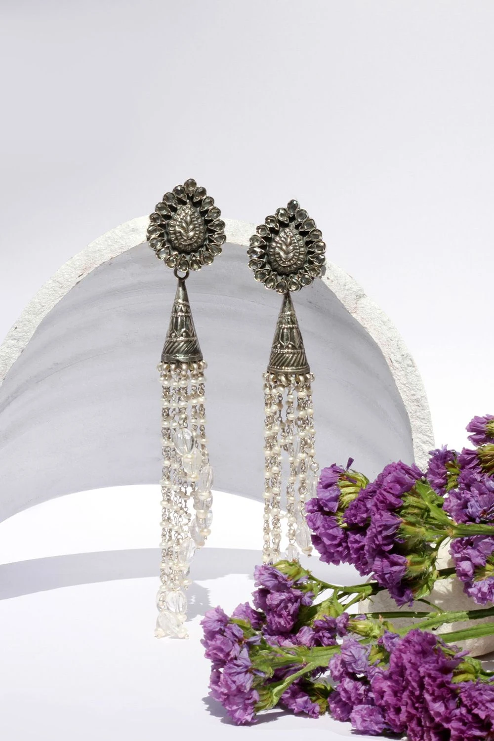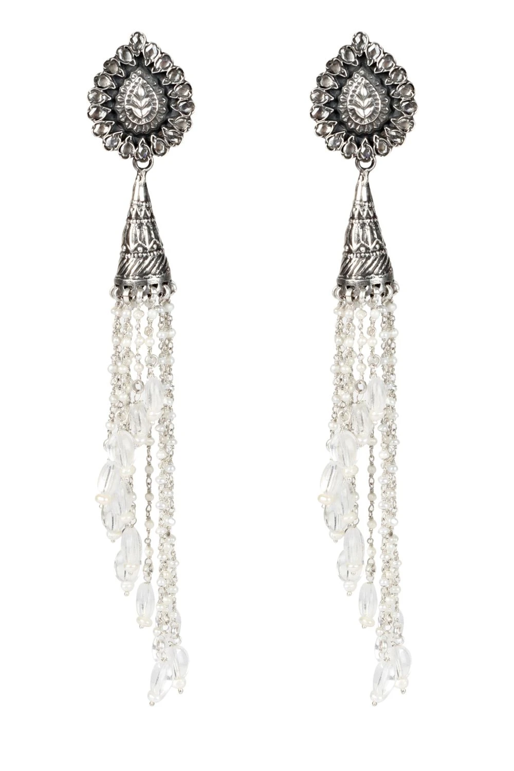 Elevate your understated looks with these statement danglers. Handcrafted in silver, these earrings are orchestrated with CZ stones & crystals & pearls. Style it with a kurta set for a boho flair.