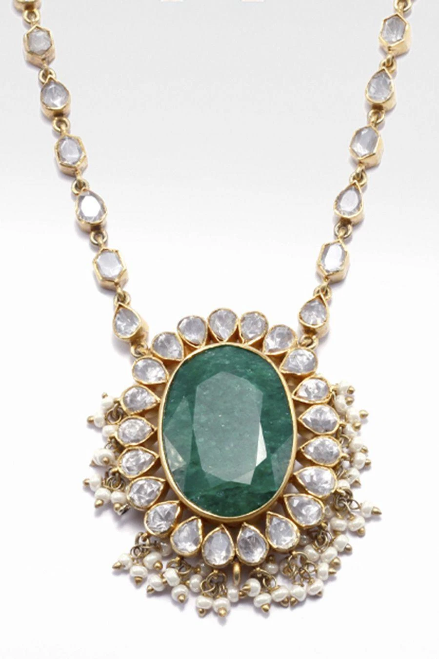 This chic handcrafted silver necklace is the perfect accessory to style with your daytime looks. This silver necklace is handcrafted in 24k gold plating further studded with moissanite gemstones and green onyx.