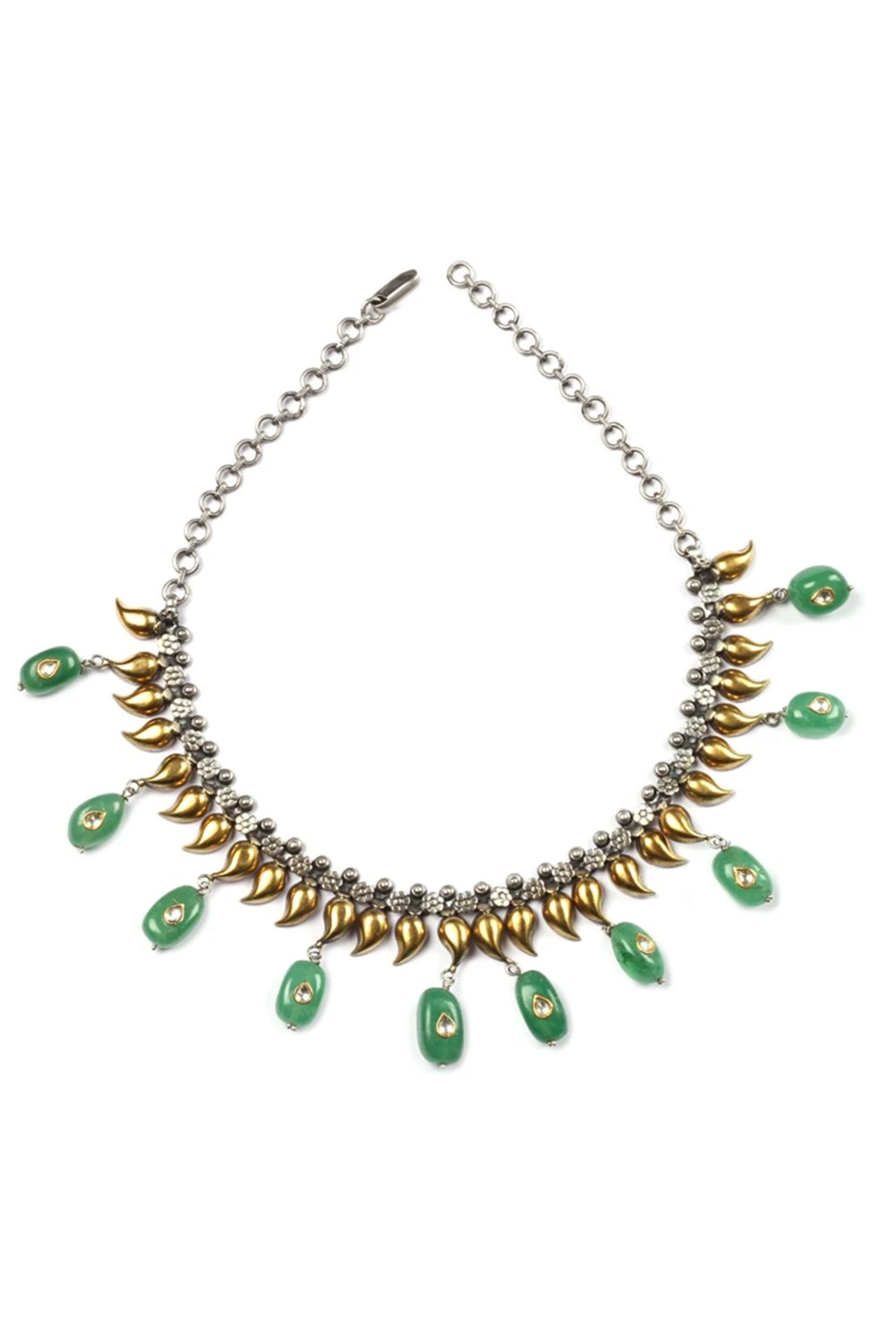 This handcrafted silver necklace is strung with turquoise semi precious stones with inlay details. This elegant piece is perfect to dress up your daytime looks. Style it with a pastel chiffon sari or a breezy tunic to instantly elevate your look.