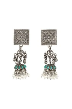 These drop earrings feature a unique & offbeat design crafted in silver. They are accented with turquoise stone & pearls. For a statement look, style these with a white poplin oversized shirt & denims.