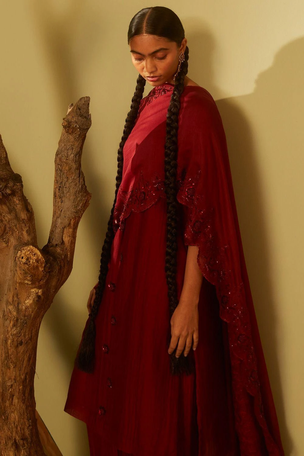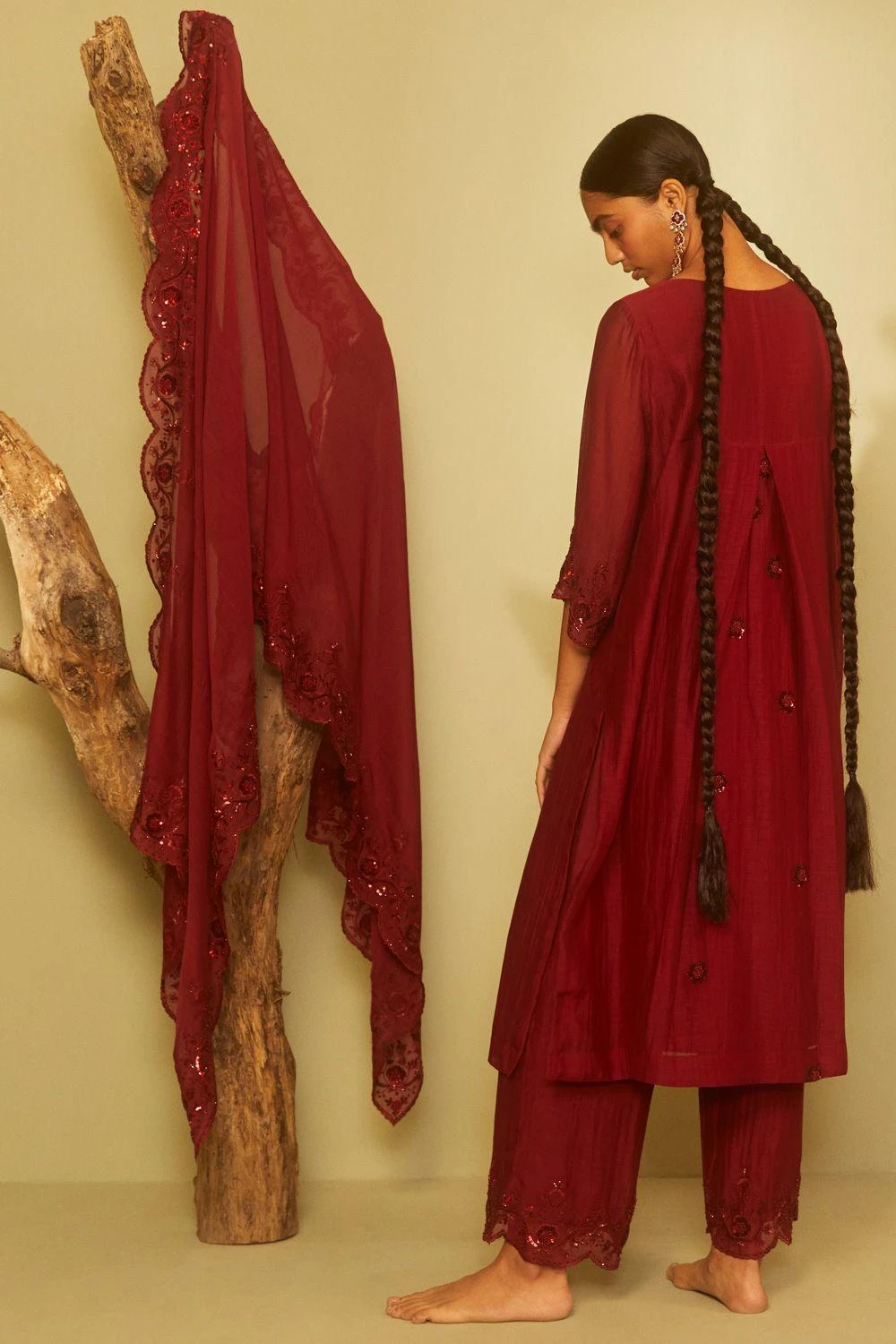 Take your layering game a notch higher with this maroon cutwork dupatta. Crafted in chanderi silk, this dupatta features sublte hand embroidered details. Style this dupatta with the maroon hand embroidered kurta set to complete the look.