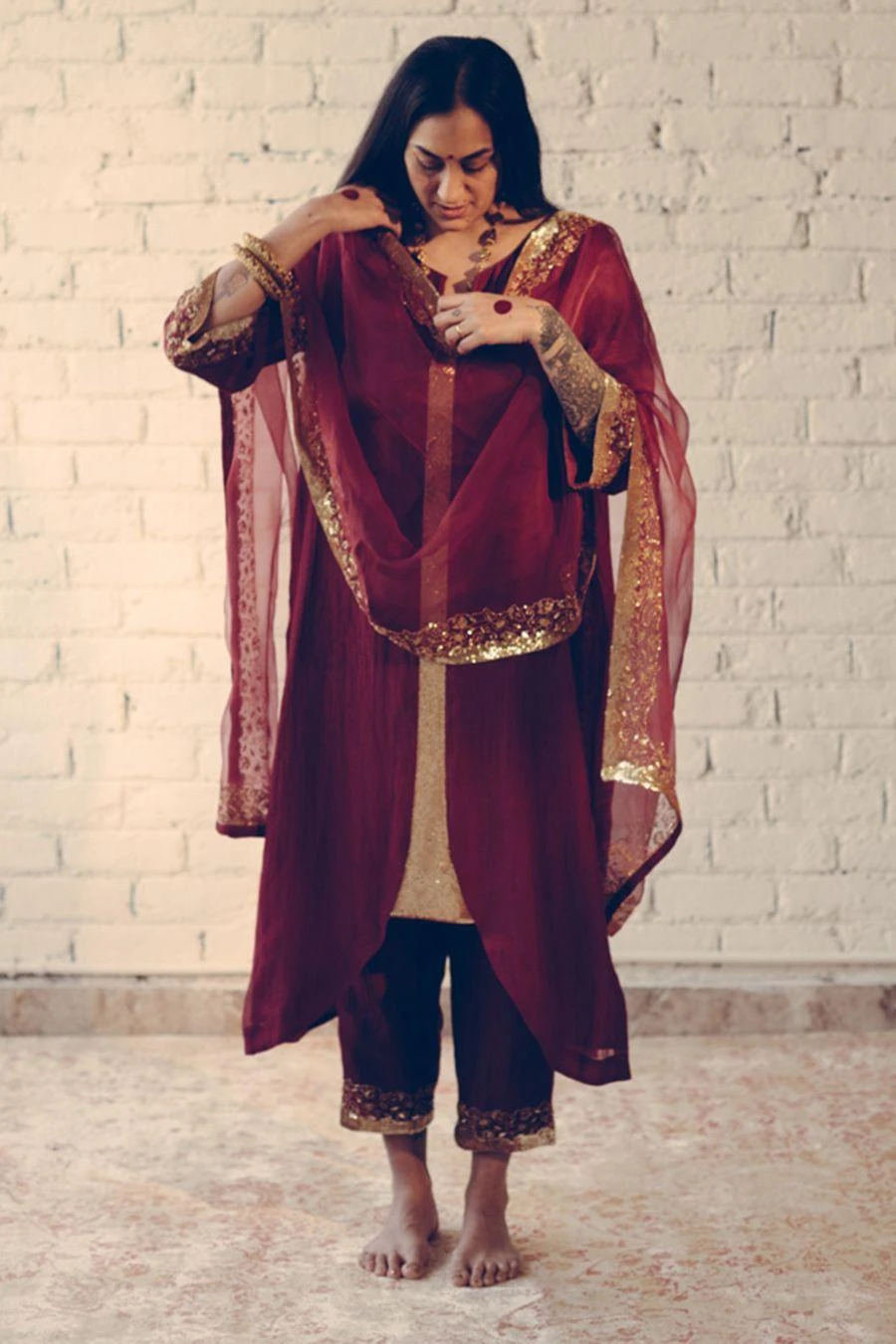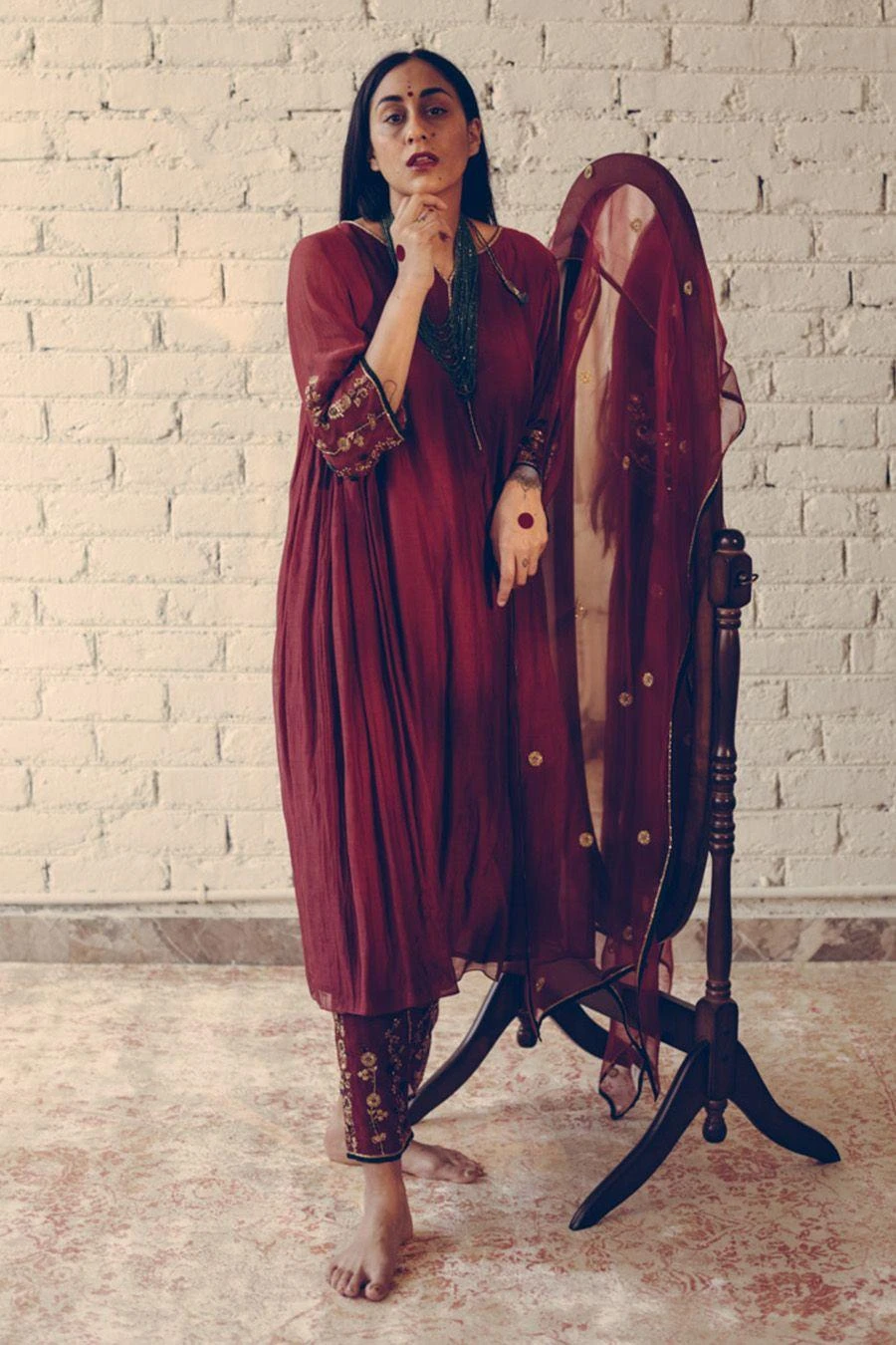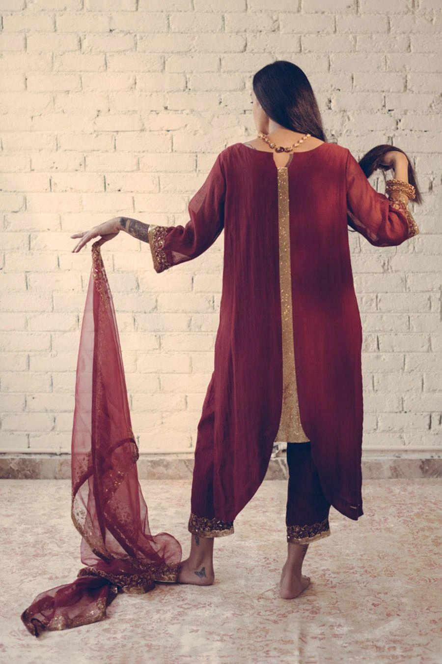 Take your layering game a notch higher with this maroon stole. Crafted in organza silk, this dupatta features hand embroidered details. Layer it over the Maroon Nizam kurta set from the collection to complete the set.