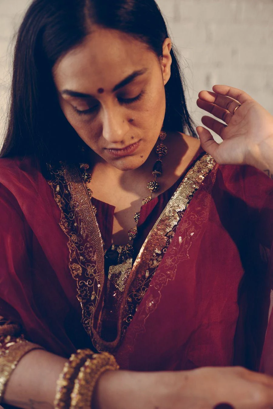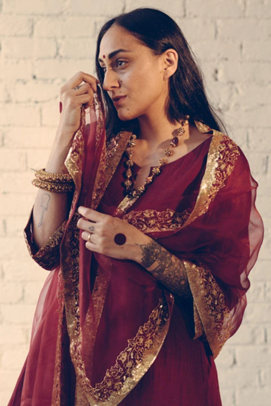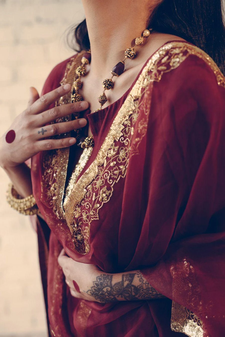Take your layering game a notch higher with this maroon stole. Crafted in organza silk, this dupatta features hand embroidered details. Layer it over the Maroon Nizam kurta set from the collection to complete the set.