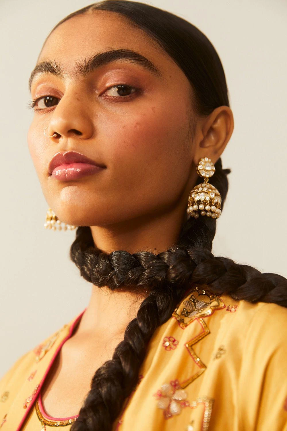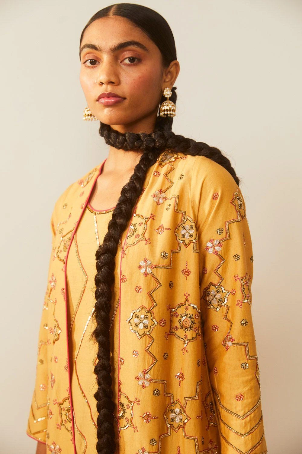 Swap your dupattas for jackets this festive season. Crafted in cotton silk, this set features a hand embroidered jacket paired with a yellow undershirt & pants. Style this set with a pair of statement earrings & a potli bag to complete the look.