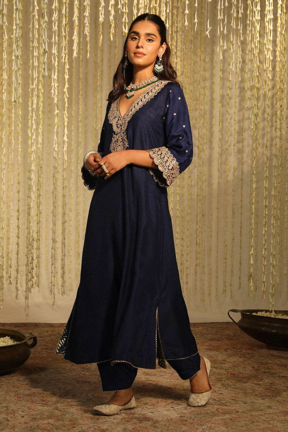 Experience grace in the Blue Mysha ensemble. Pure silk adorned with kirandori embroidery & sitaara. The long kurta boasts a V-neckline & three-quarter sleeves paired with a doghri salwar. Finished with banarasi fabric, it defines luxury effortlessly.