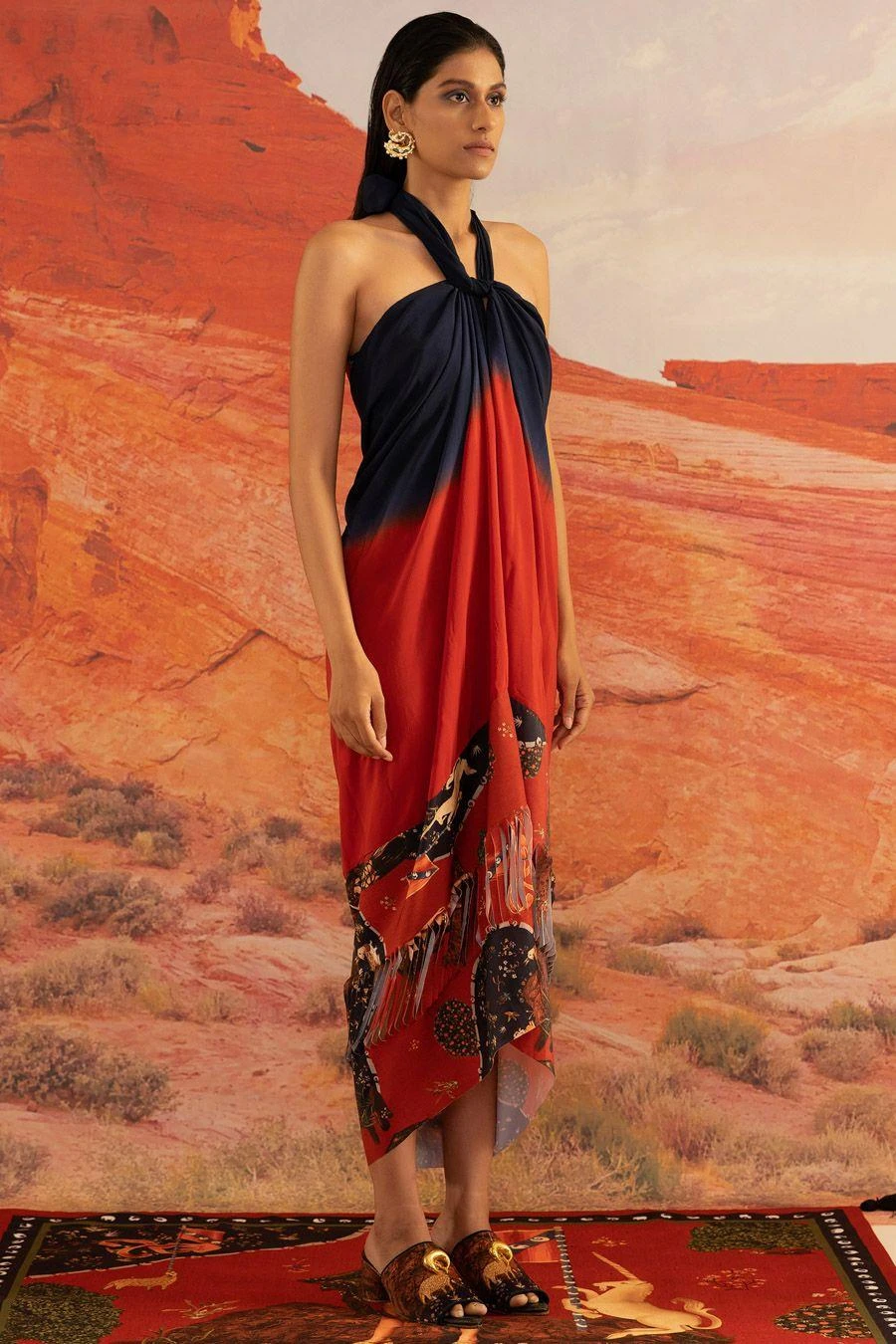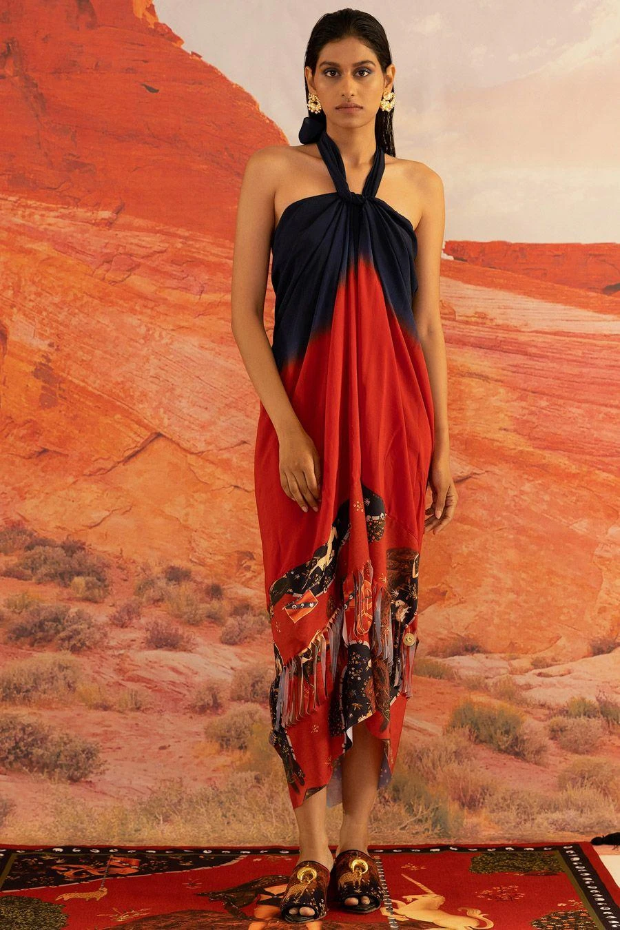 Wilding louvred paneyo is the brand’s staple and is updated in a whimsical hue of haemo. Cut from crepe, it is elevated with signature print louvers on hem. Drape it over your swimsuit for a sundown beach stroll.