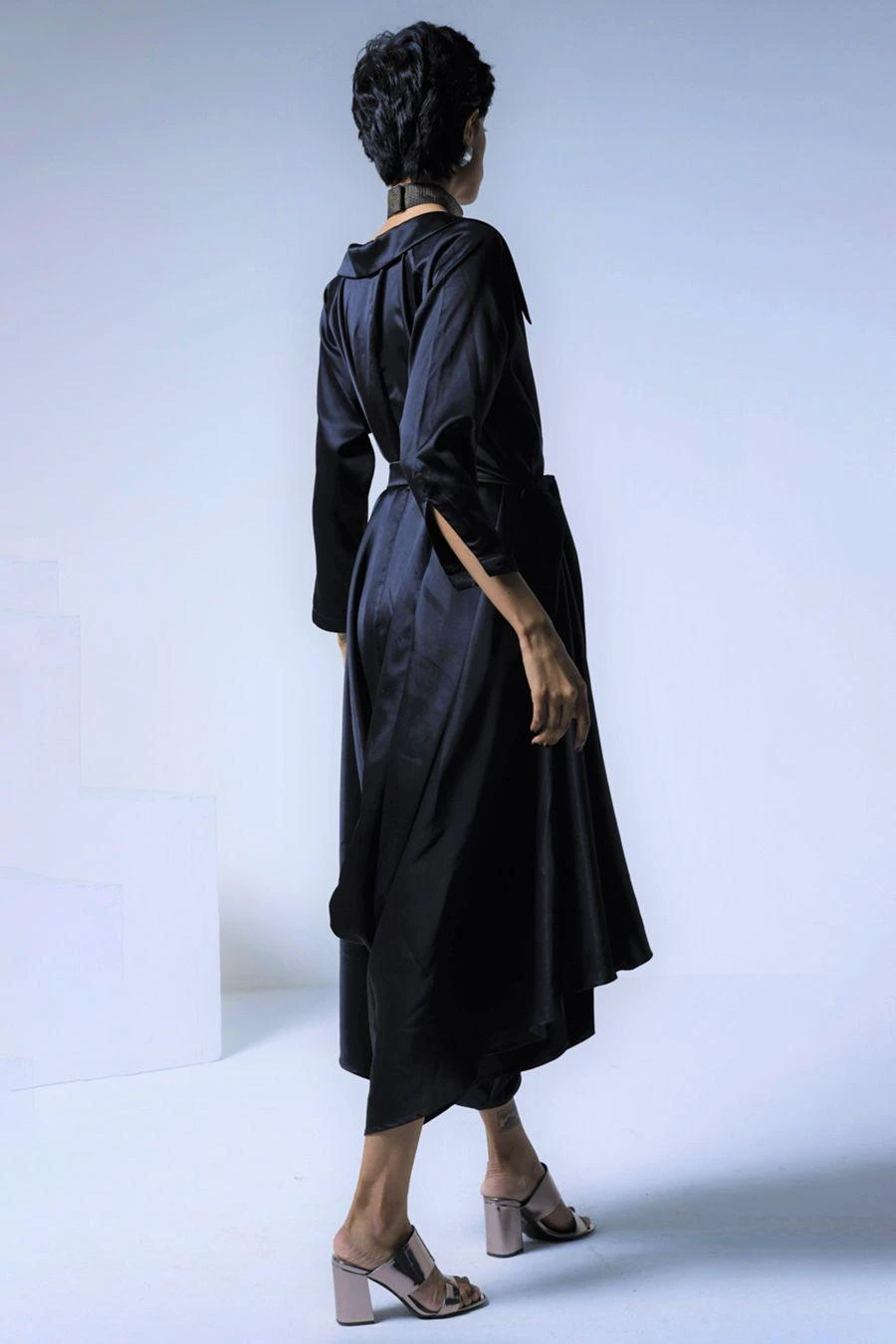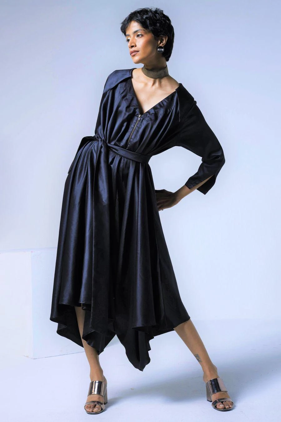 This black jumpsuit falls in the realm of luxe minimalism. Crafted in silk & satin, this collared jumpsuit features a cowl derail paired with the coordinating belt. Add a pair of dangler earrings to complete the look.