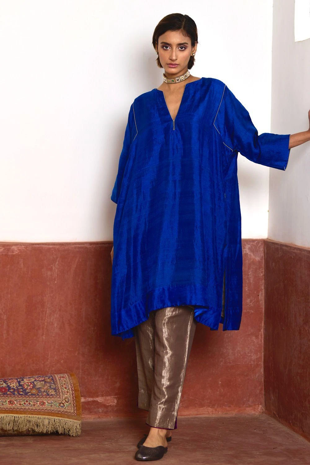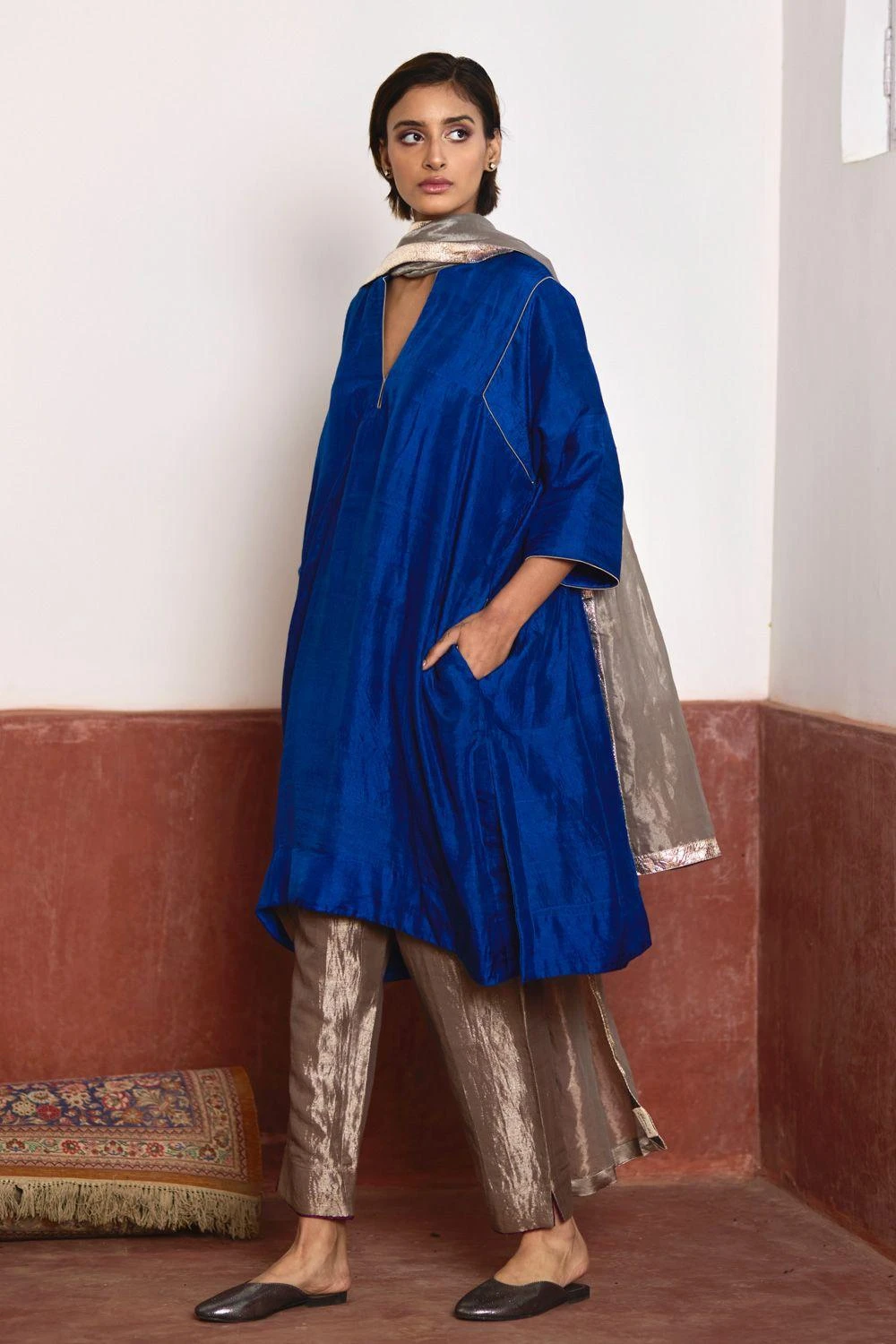 Unveiling the stunning royal blue jhabla kurta, crafted in luxurious pure silk. Elevate your elegance by coupling it with shimmering silver tissue pants, creating a sophisticated and complete ensemble suitable for any upscale affair