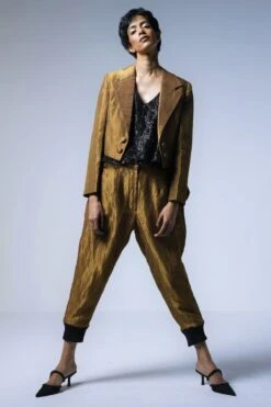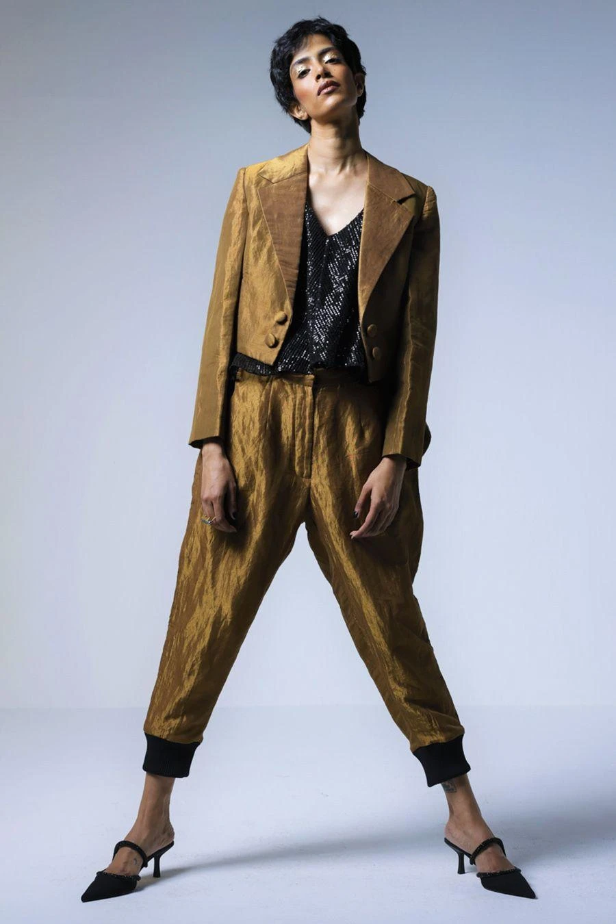Take your layering game a notch higher with this copper and gold blazer. Crafted in handloom tissue, this cropped jacket features a lapel collar. Layer it over a dress or a co-ord set from the collection to complete the set.