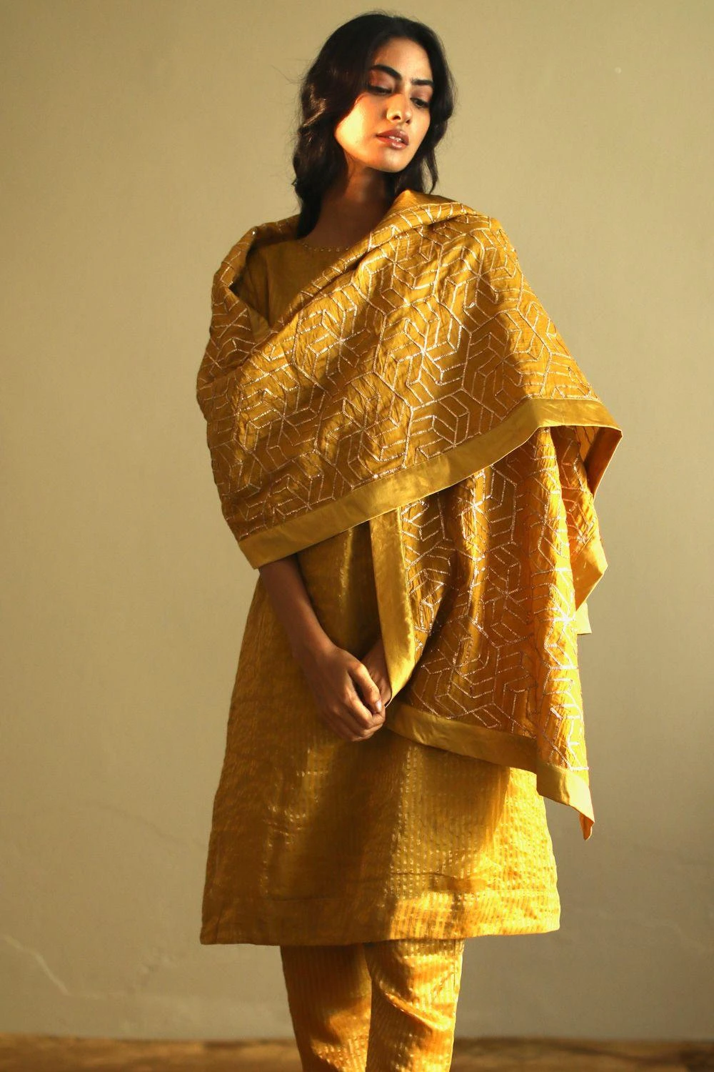 Add an elegant touch to your festive looks with this ochre sheer stole. It is cut in sumptuous chanderi fabric and accented with octa gota details.