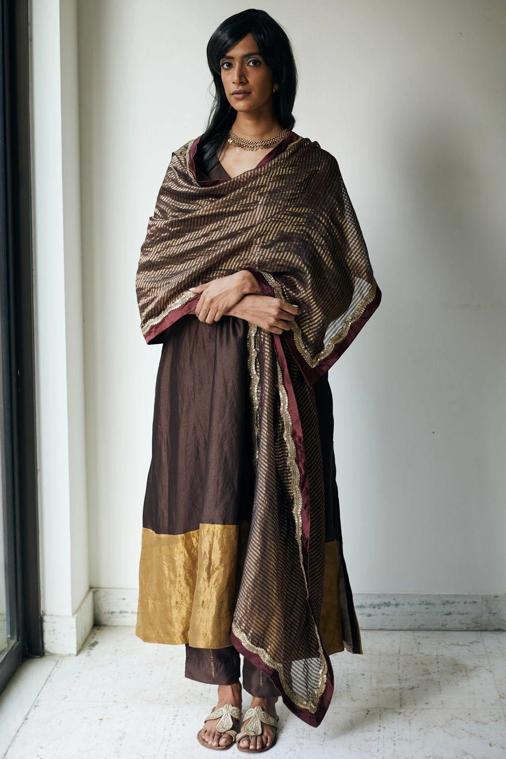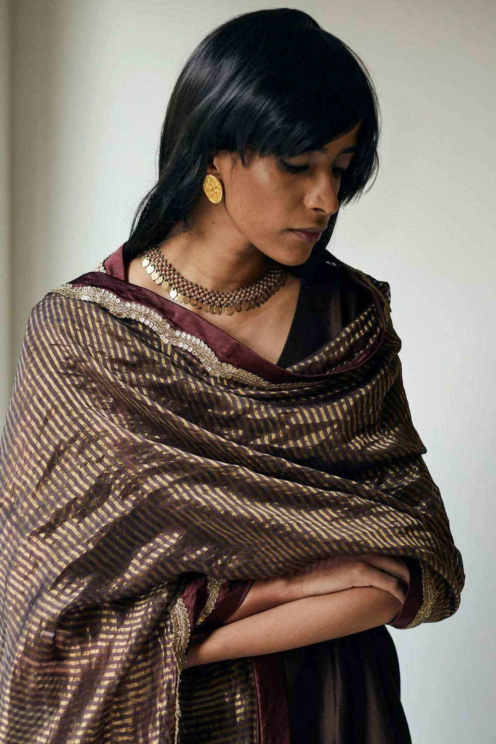 Enliven your festive looks with this tasteful dark brown stole. It is made of handloom stripe tissue and enhanced with an elegant sequin border.