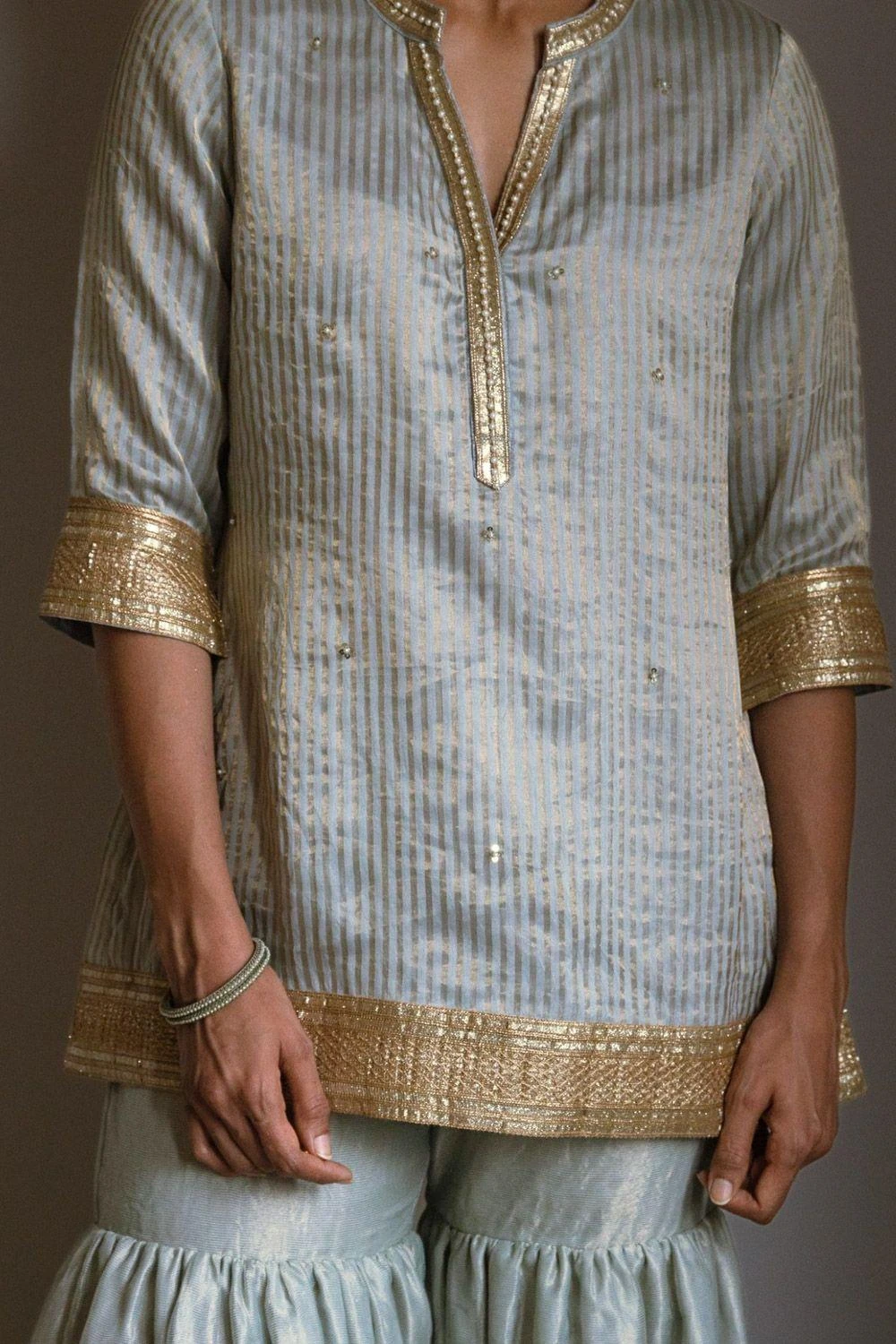 The perfect amalgamation of style and comfort, this gharara set works across occasions. Crafted in handwoven chanderi silk, this set features a hand embellished short kurta paired with a coordinating gharara.