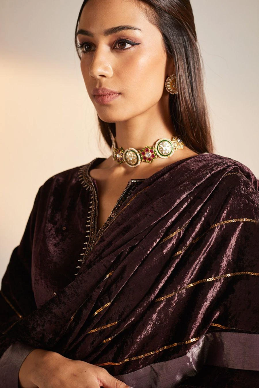 Take your layering game a notch higher with this black dupatta. Crafted in silk velvet, this minimally embroidered dupatta can be paired with the Black saifi gharara set from the collection.