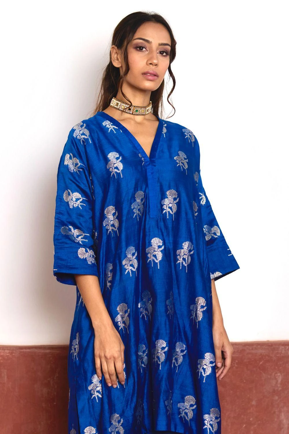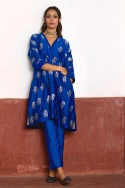 Captivate with the shahi kurta in blue banarasi brocade. Perfect for the new yearÆs party, exuding class and elegance. Complete the look with matching blue pants for a stunning ensemble.
