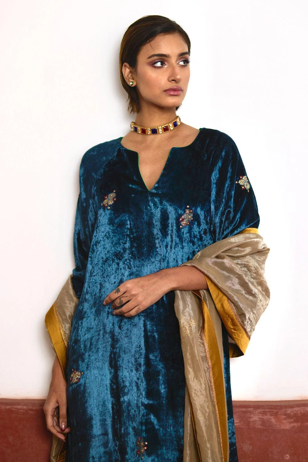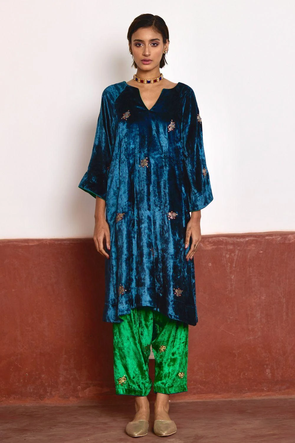 Rumaani presents the iconic kurta in exquisite teal velvet, a timeless piece for celebrating Indian festivities. This set of two includes a versatile kurta, beautifully complemented by a green velvet salwar.