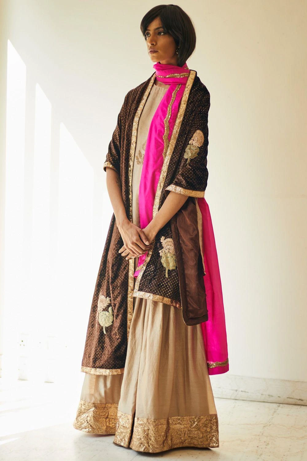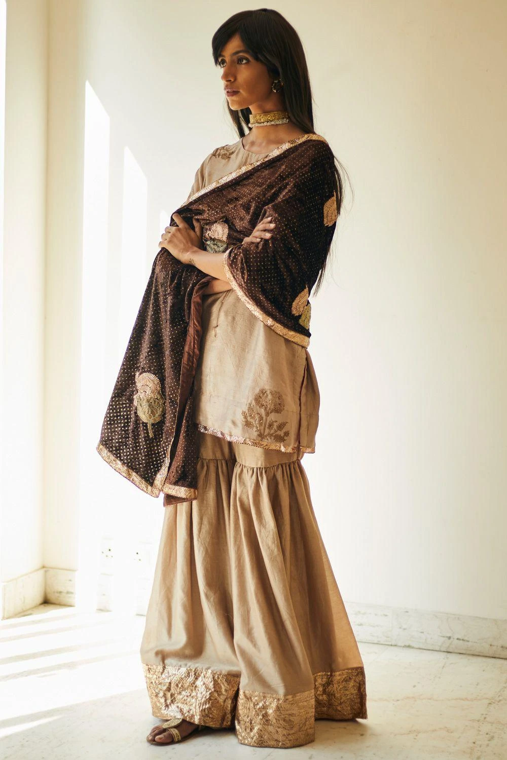 Keep it classic & minimal this winter festive season in this sharara set. It features a short mulberry silk kurta in warm chai beige, highlighted with sequin work & foil printed motifs, and paired with matching chanderi sharara pants.