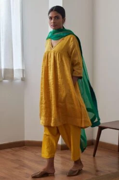 The perfect amalgamation of style & comfort, this kurta set works across occasions. Crafted in chanderi, this set features a hand embellished kurta paired with coordinating pants. Add a pair of statement earrings to complete the look.