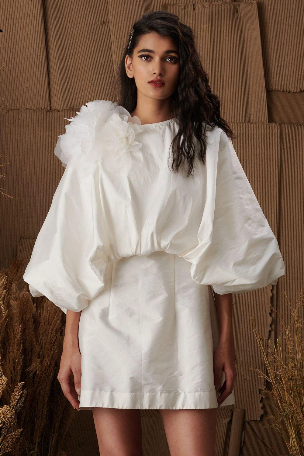 Classic, elegant and an absolute must have. This pristine white mini dress is crafted in taffeta to give it a structure. The sleeves adorn drapes rendering a feminine touch. Style it with a good pair of heels and some dainty jewellery.