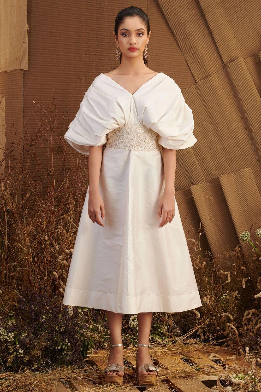 Angelic, ethereal and more than just a piece of clothing. This midi dress is immaculately pristine, ticking all the boxes of grace. Crafted in taffeta, it features powerful draped sleeves. Pair it with statement earrings to finish off the look.