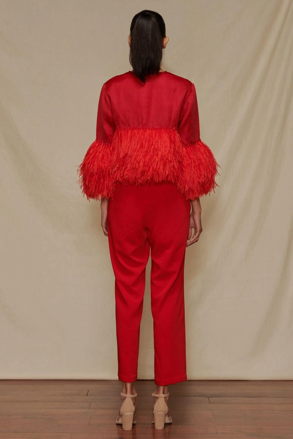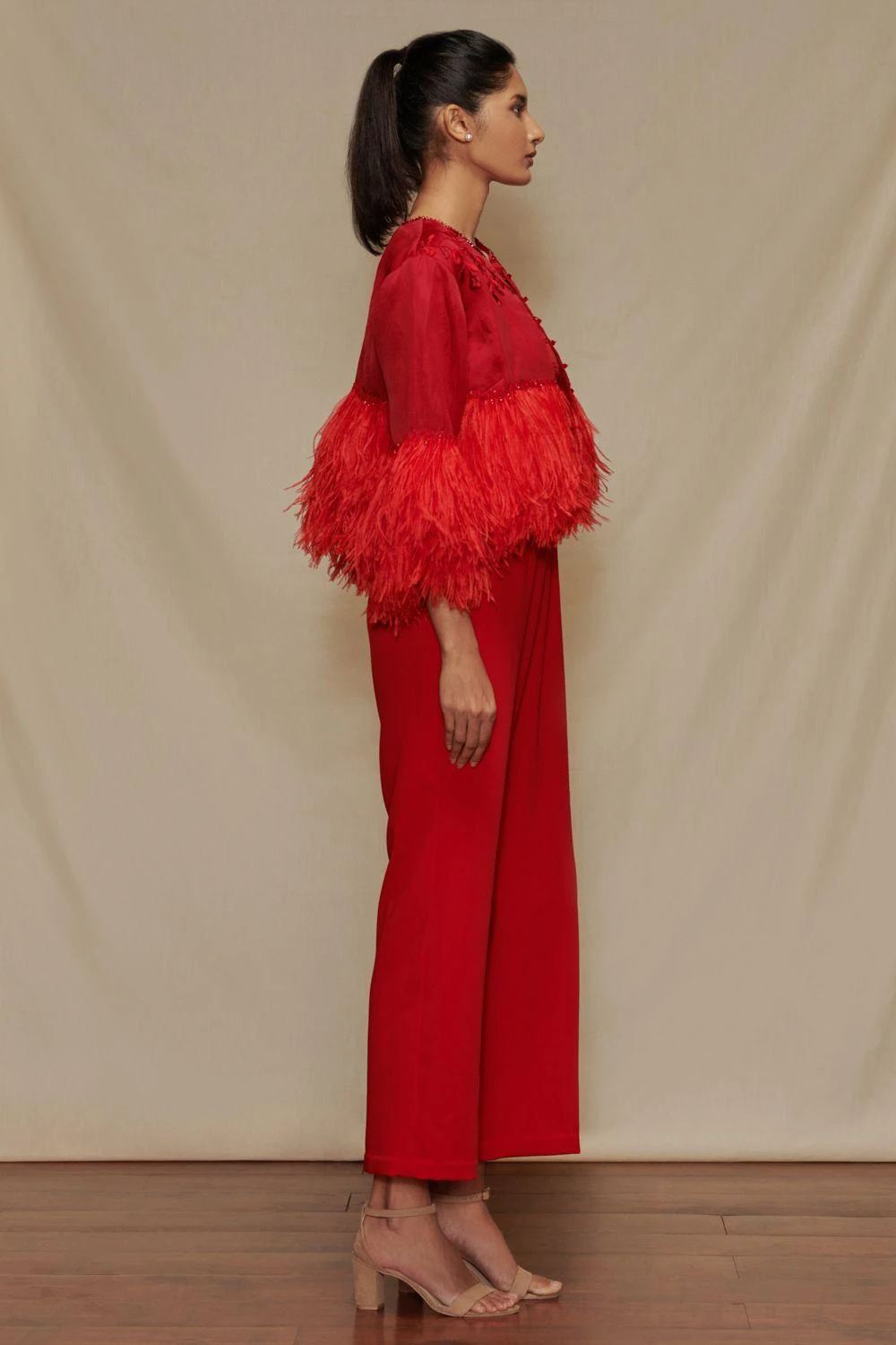 Make a bold & fiery statement at your cocktail evening in this red jumpsuit & capelet. The jumpsuit is made in a plain crepe base, while the capelet is accented with floral embroidery and extravagant feather details.