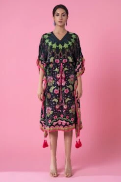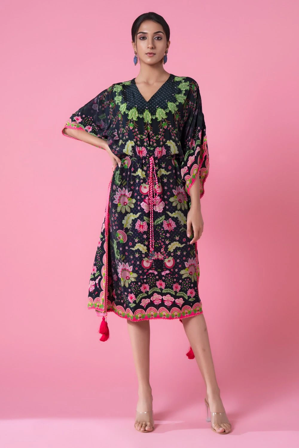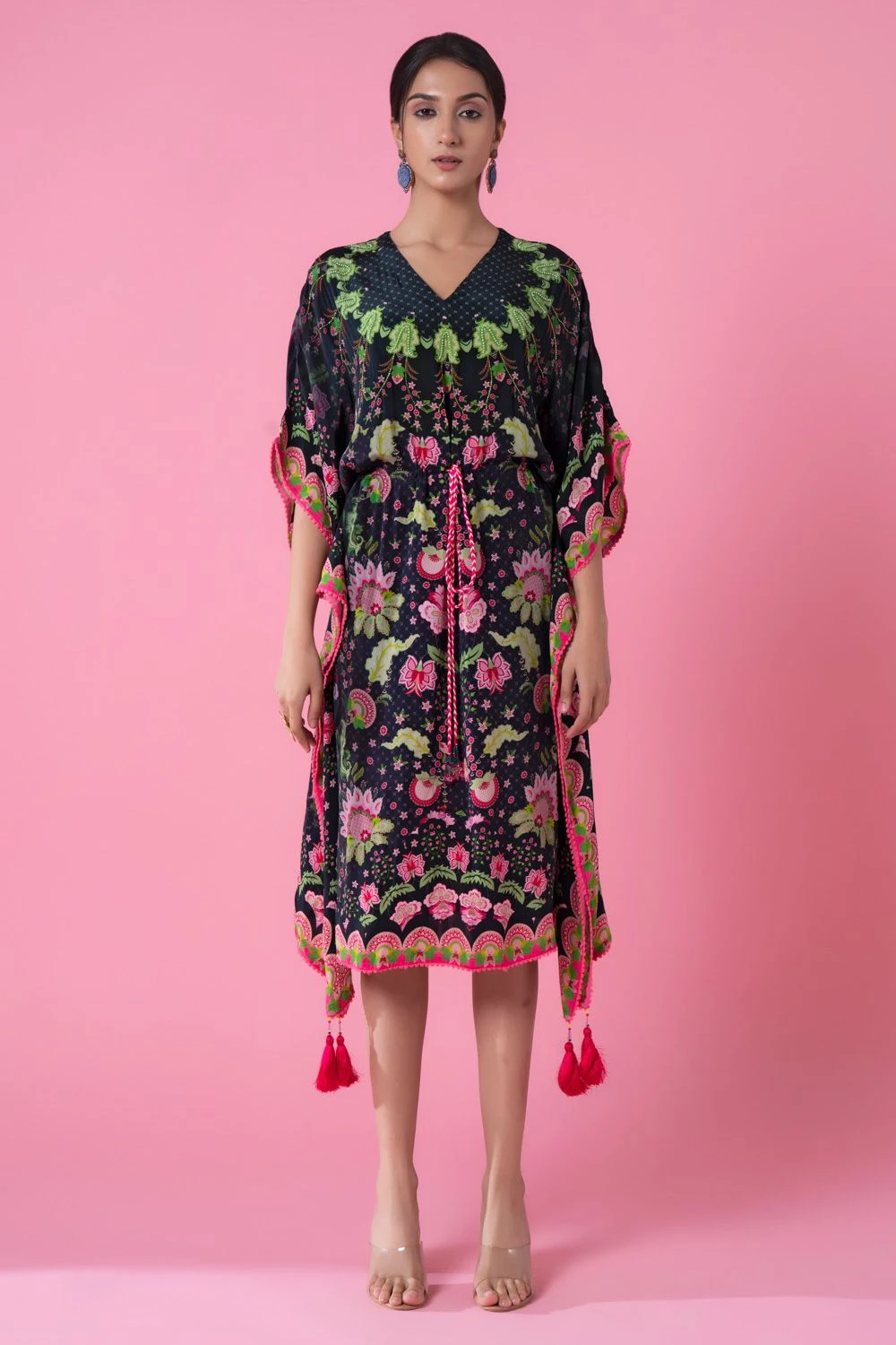 Elevate allure with this opulent floral printed kaftan, adorned with embroidery, playful pom-poms & a tie-up lace detail. Perfect for elite soirÃ’es, style with jewelry for a chic & luxurious statement. Redefine elegance, make every moment exquisite.