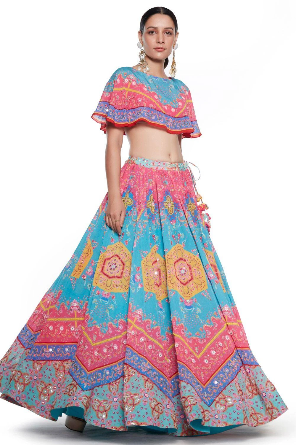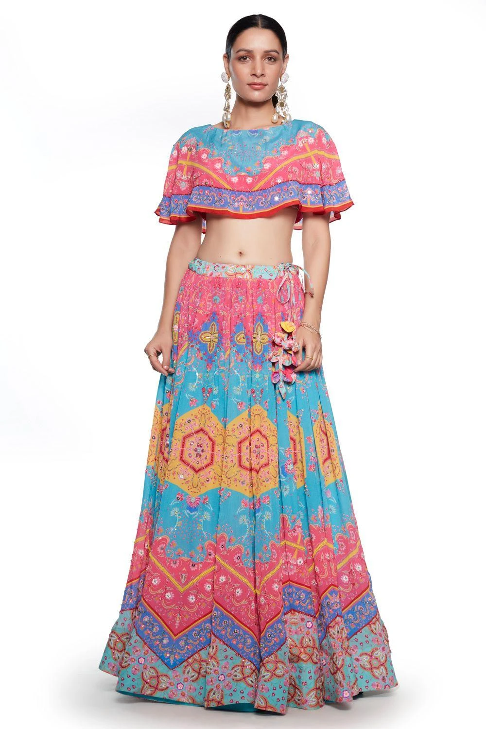 This festive season is all about vivid color & flattering silhouette, and this multi-coloured printed lehenga set will be your best bet. The lehenga is paired with a matching printed flounce crop top.
