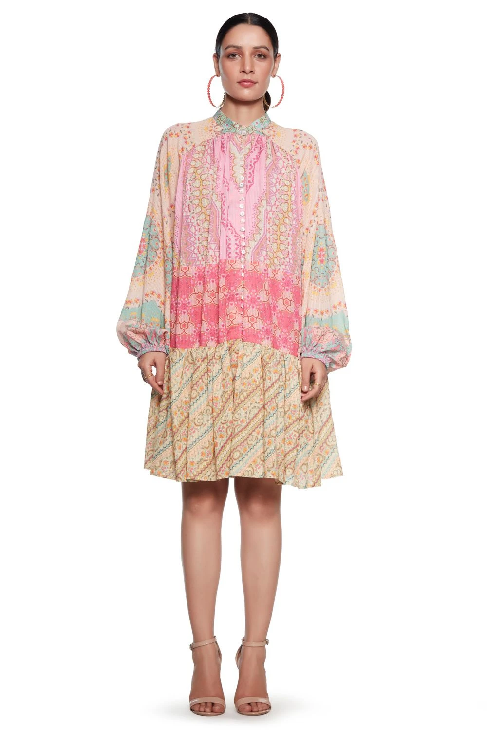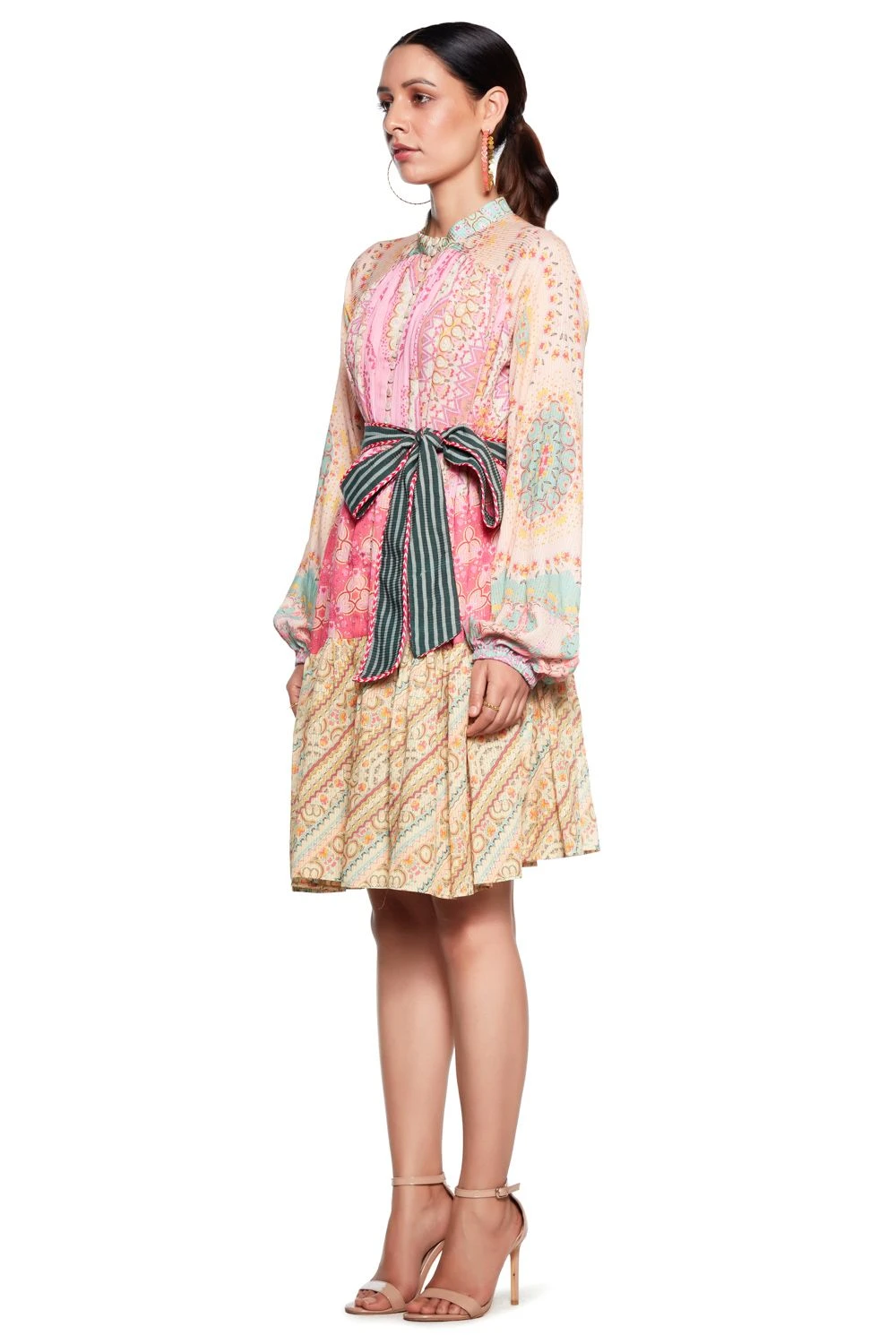 Amp up your holiday wardrobe with this vibrant & playful pink & yellow short dress. It is cut in light cotton, keeping you fresh & comfortable throughout the day. Style it with a pair of tie-up heels.