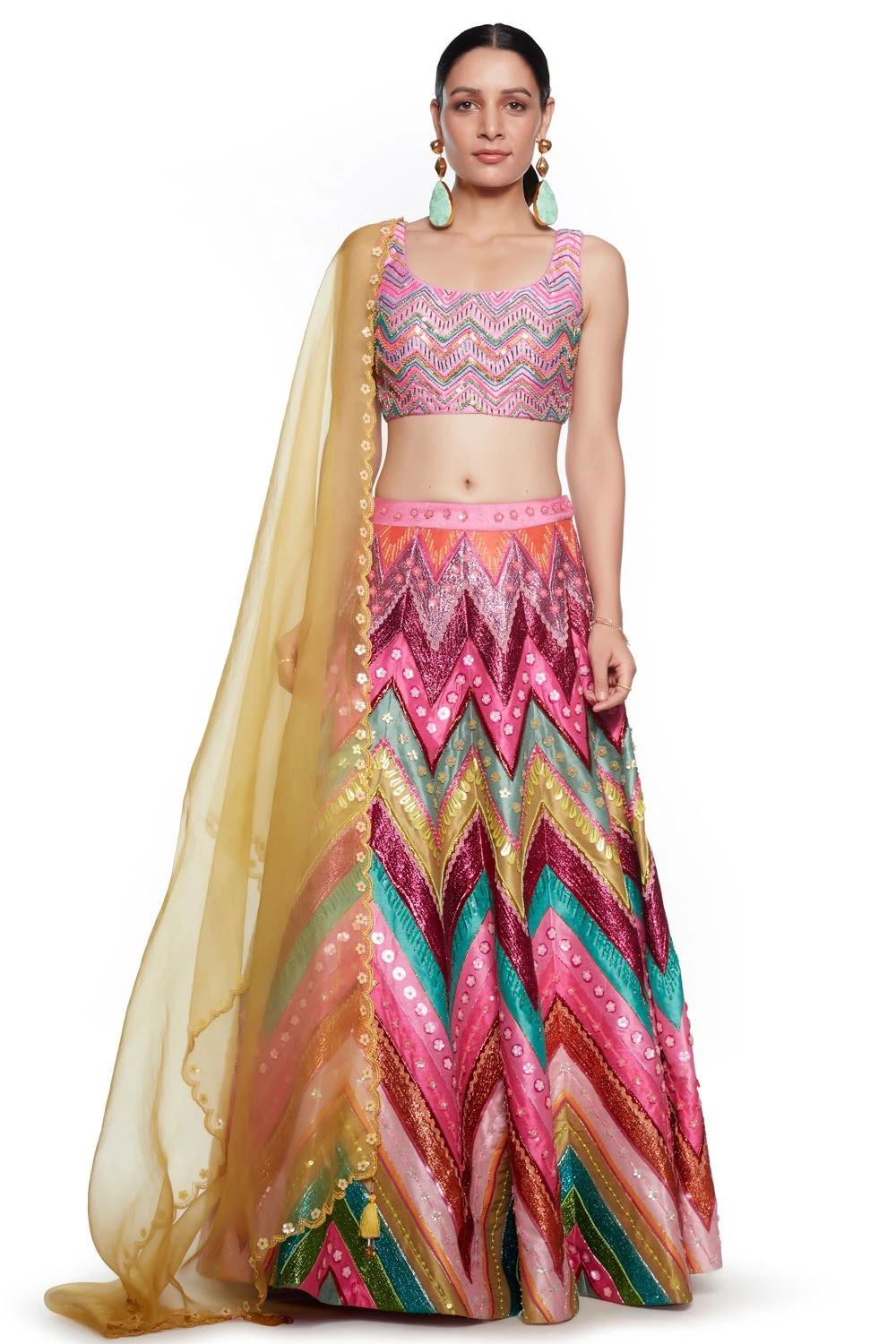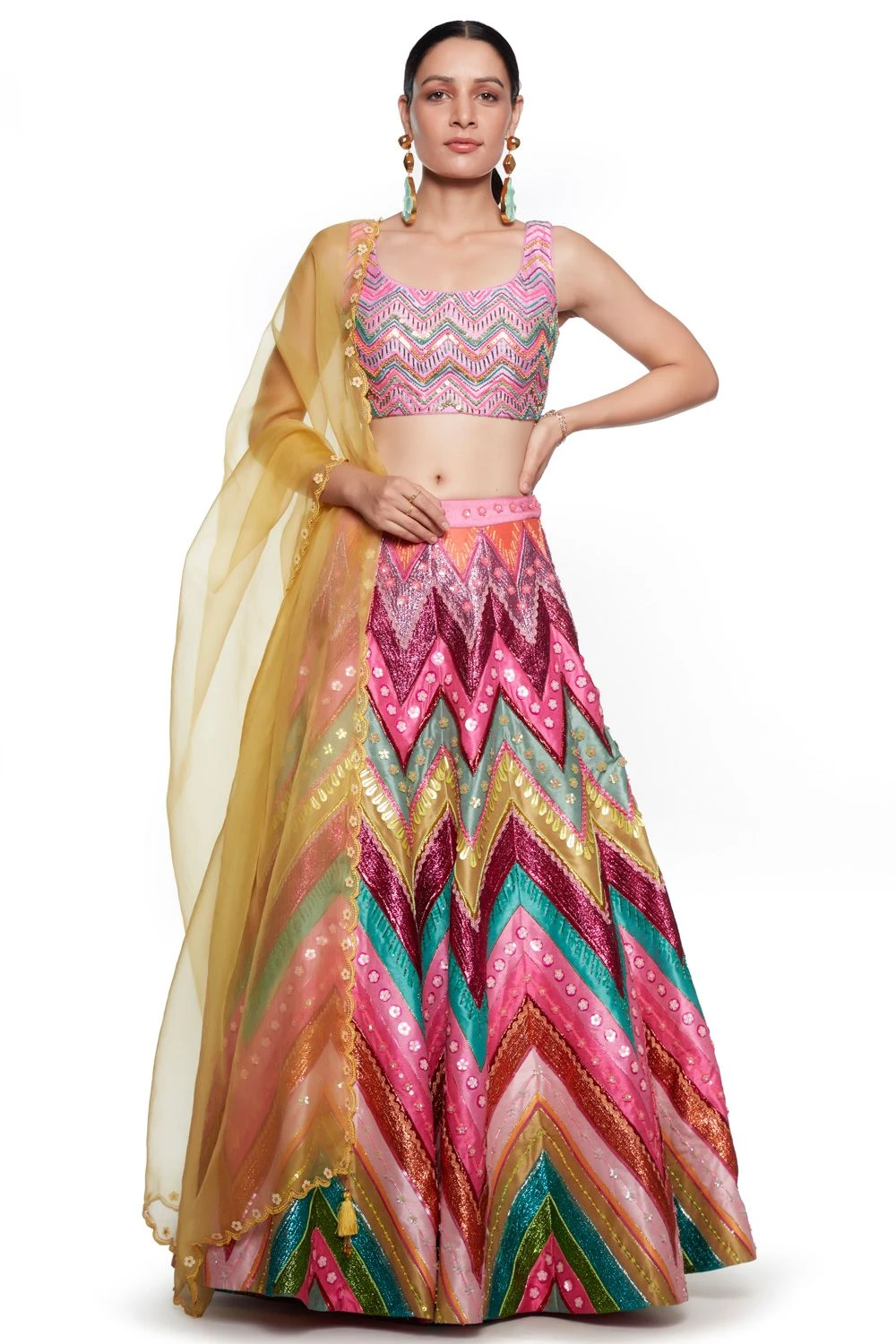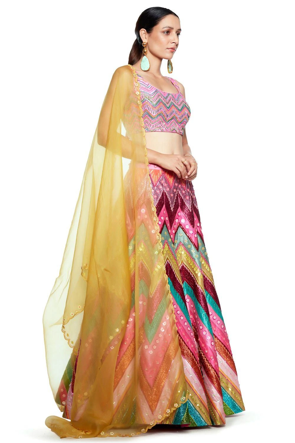 Ace your bridesmaid look in this electric & eclectic multi-coloured chevron lehenga set. The lehenga is made in raw silk and accented with colour waves & embroidery. It is paired with a pink sleeveless embroidered blouse & organza dupatta.