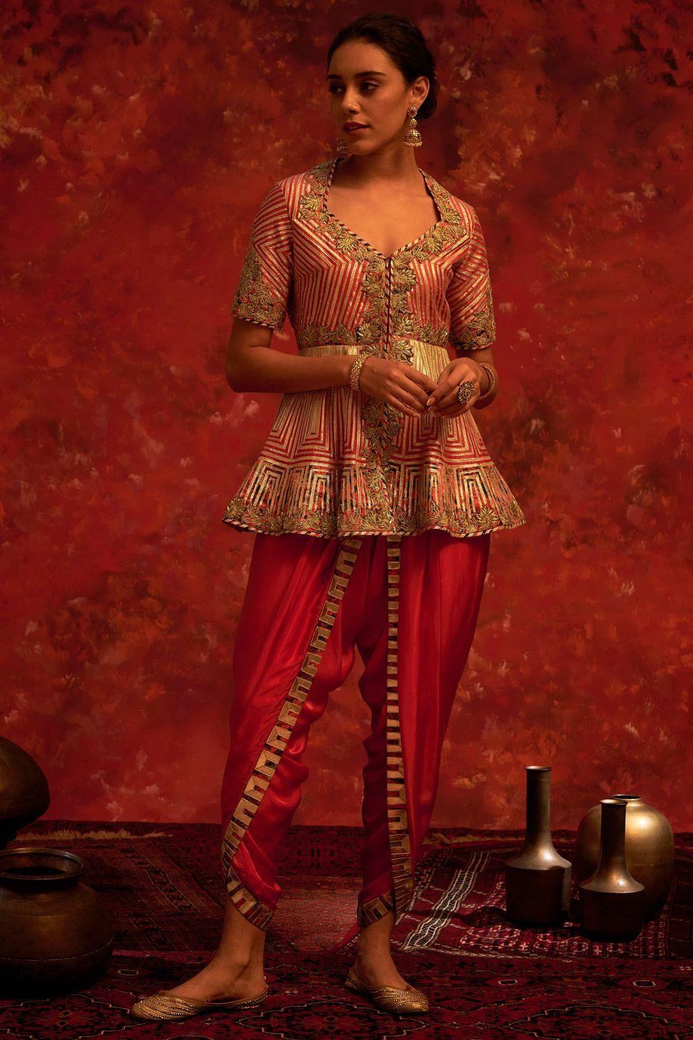 This set will see you through all kinds of celebrations this festive season. It comes with a chanderi, fully embellished gota striped peplum top with dori & dabka work paired with modal silk dhoti pants with digitally printed accents.