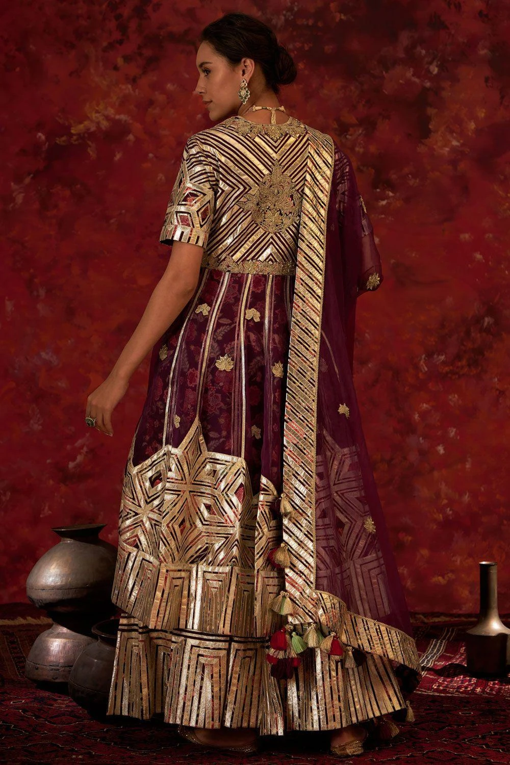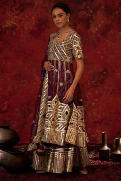 This set will see you through all kinds of celebrations this festive season. It comes with floral dabka & dori embroidered anarkali. It is embellished with a modal silk lining visible through the organza. The kurta is offset with a sharara & dupatta.