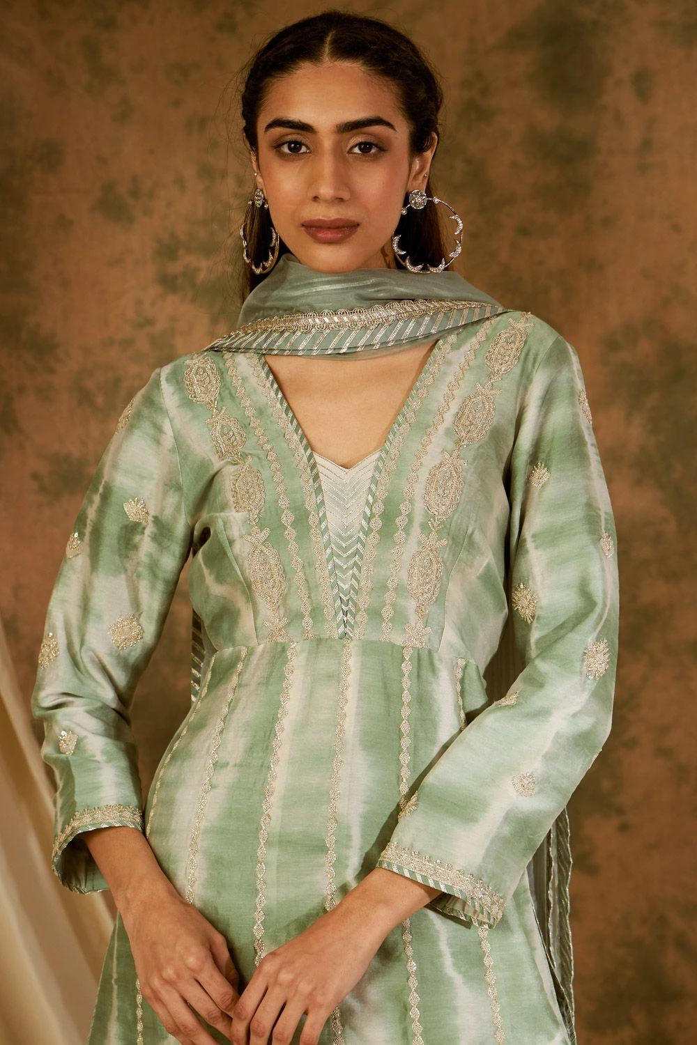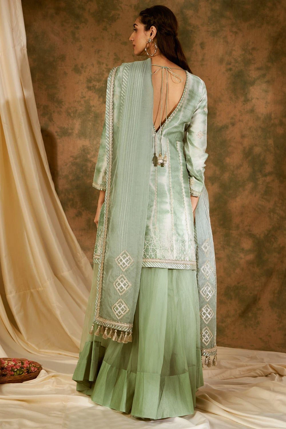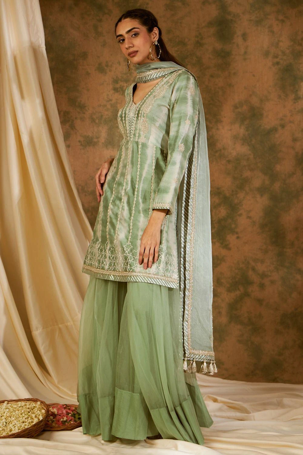 Indulge in sheer elegance with this Short A-Line Kurta set. The kurta features an alluring V-neck, adorned with delicate hand tie-dyeing and exquisite Silver Dori & Nakshi work, It is paired with a coordinating Sharara & Dupatta.