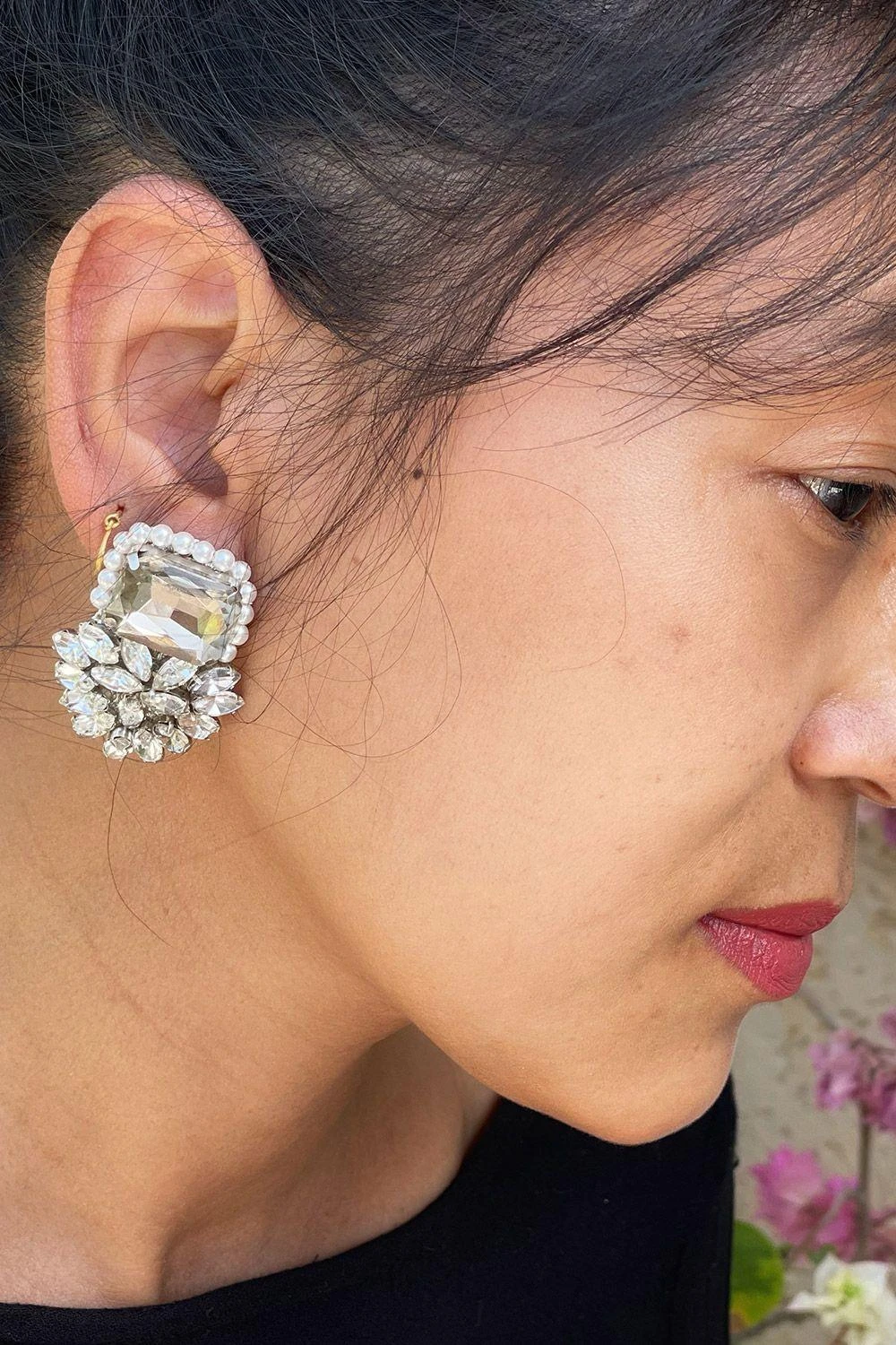 Elevate a minimal look with these square crystal statement earrings. They feature intricate petal and leaves embellishments. Style these with Indian or contemporary looks with equal ease.
