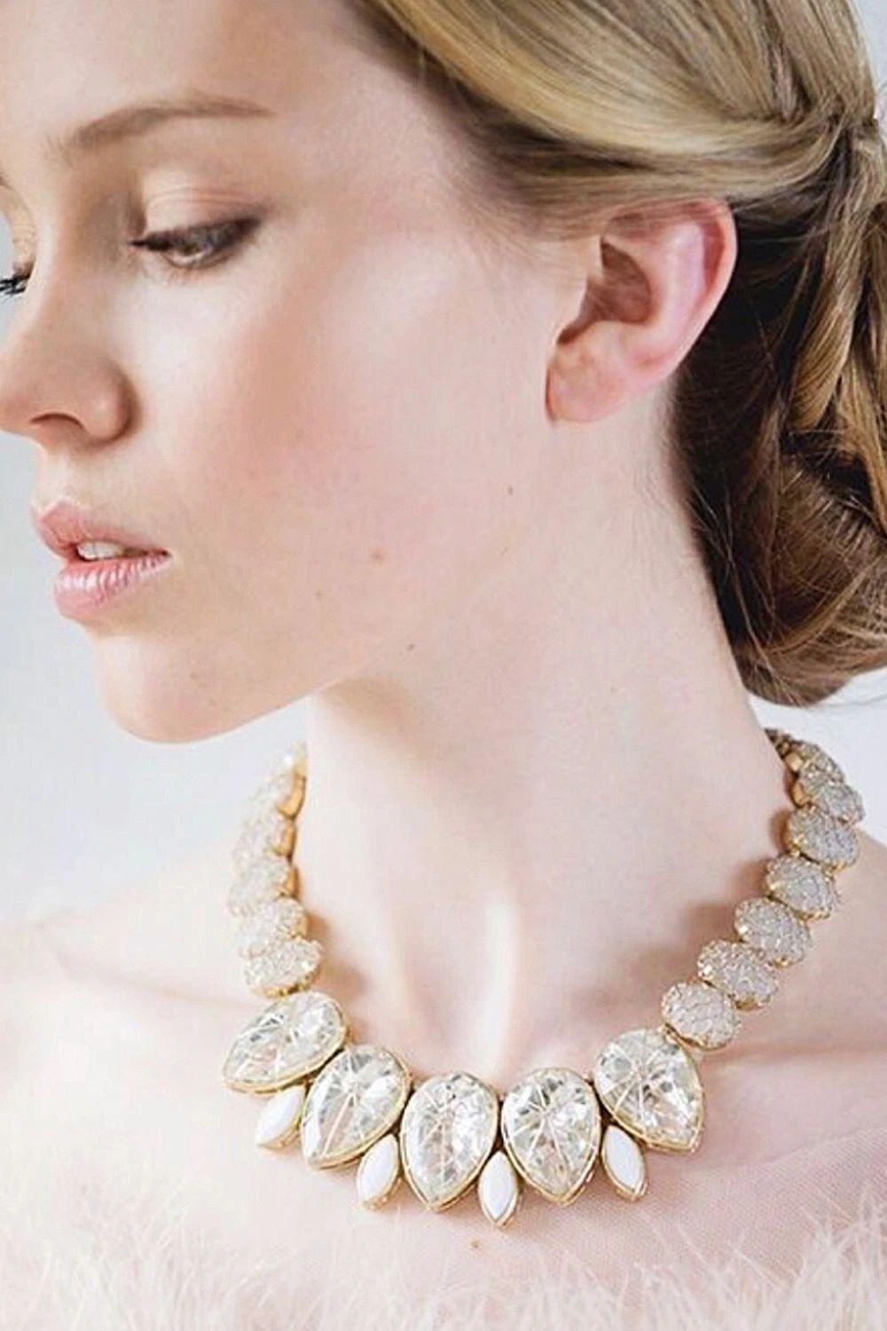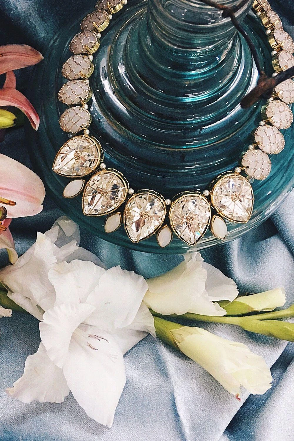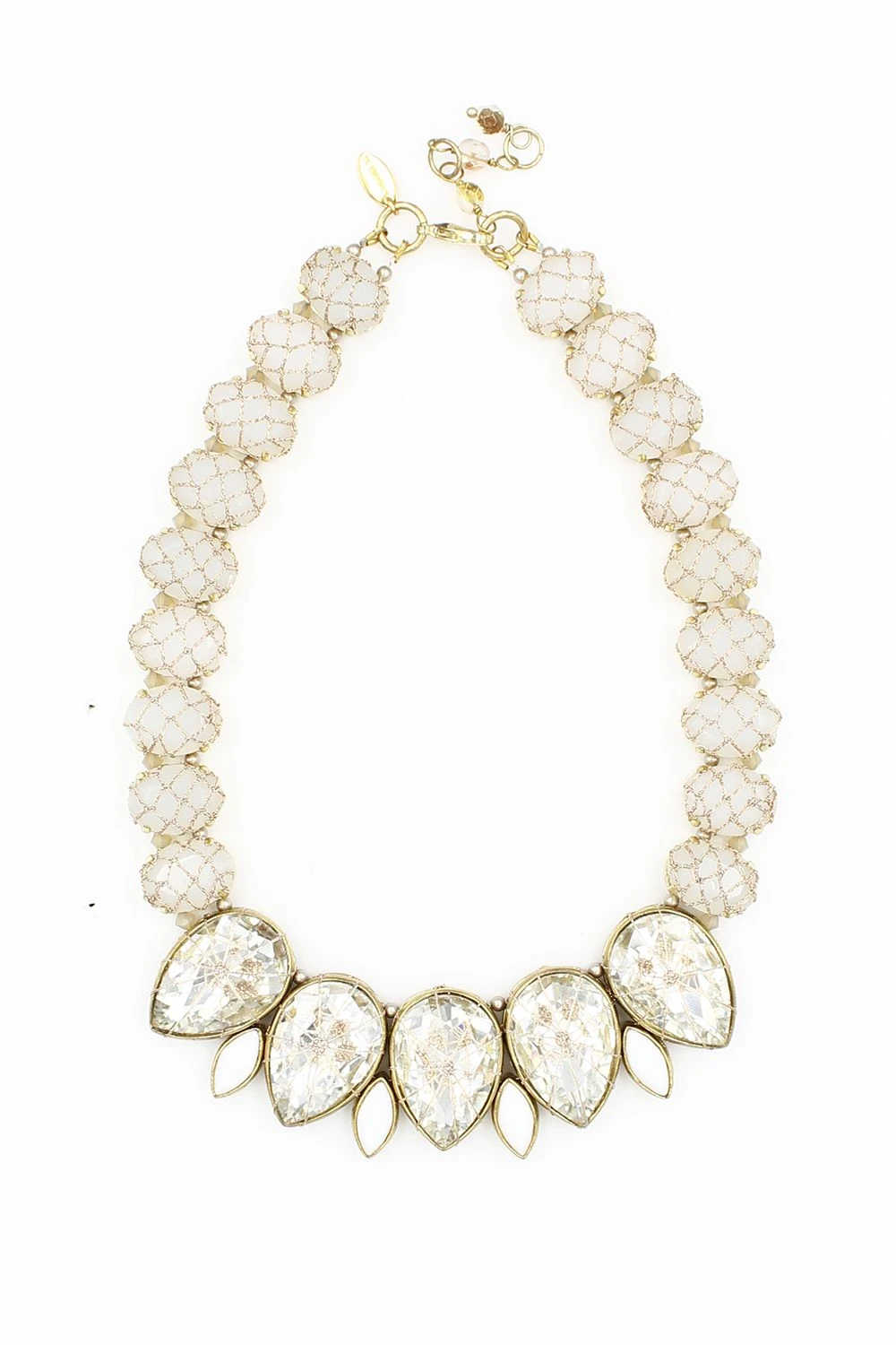 This bib necklace features stones engulfed in a light ivory peach crochet mesh. Elevate any minimalistic Indian or contemporary look with equal ease by styling it with these exceptional pair.