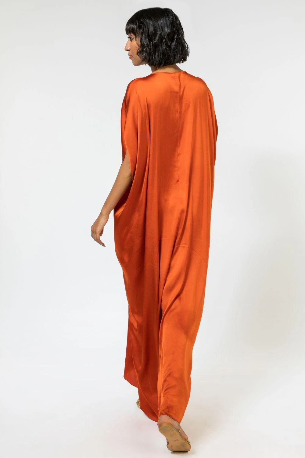 This flirty burnt orange dress is the perfect cherry on top outfit for your holiday. It is cut in fluid silk satin fabric with a front knot and cascading drape details. Finish your look with a delicate layered necklace.