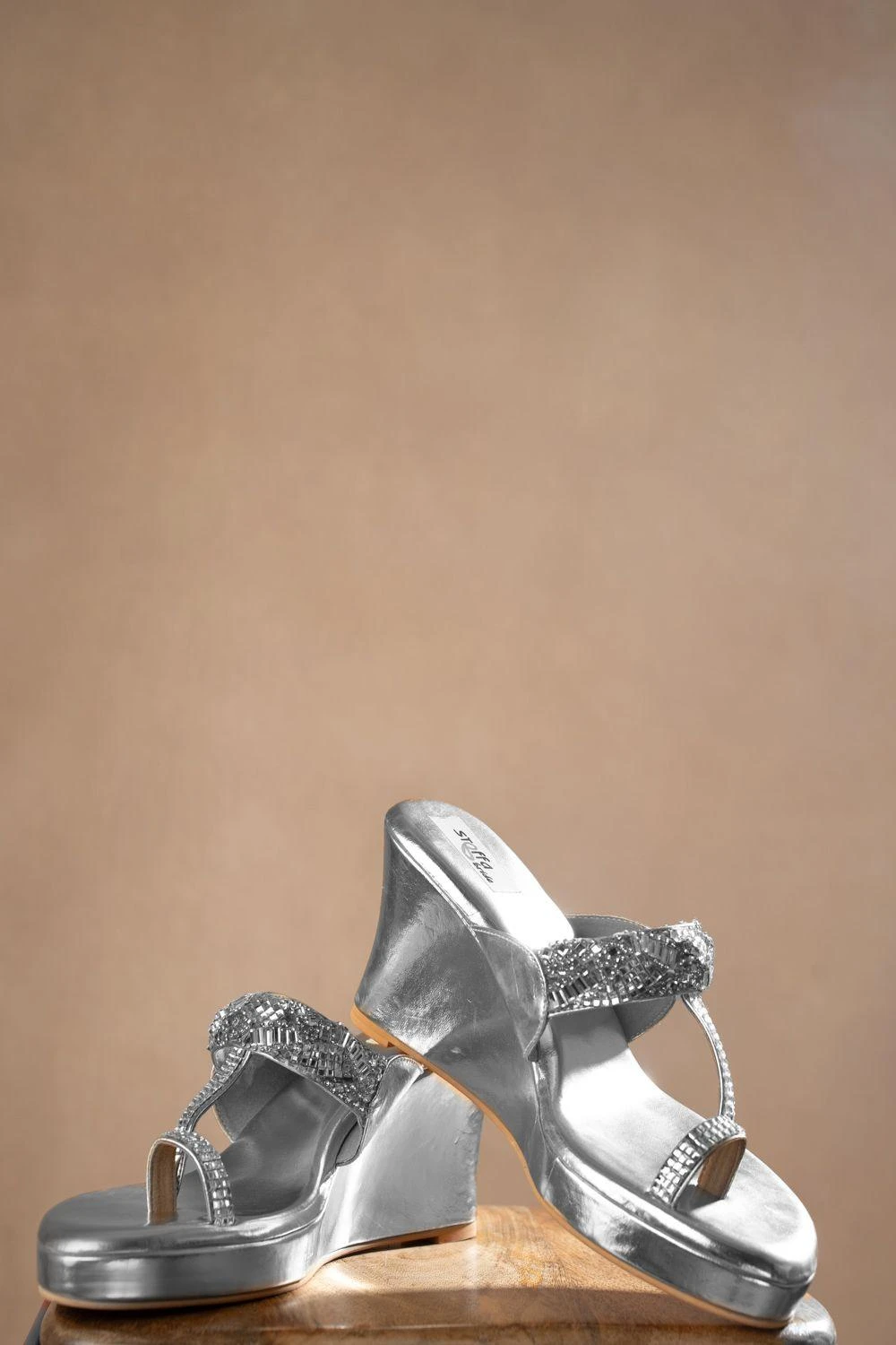 Elevate your glamour with these Gold Crystal Twist Wedges. These wedges feature a captivating twist design adorned with sparkling crystals, adding a touch of effortless elegance to your every step.