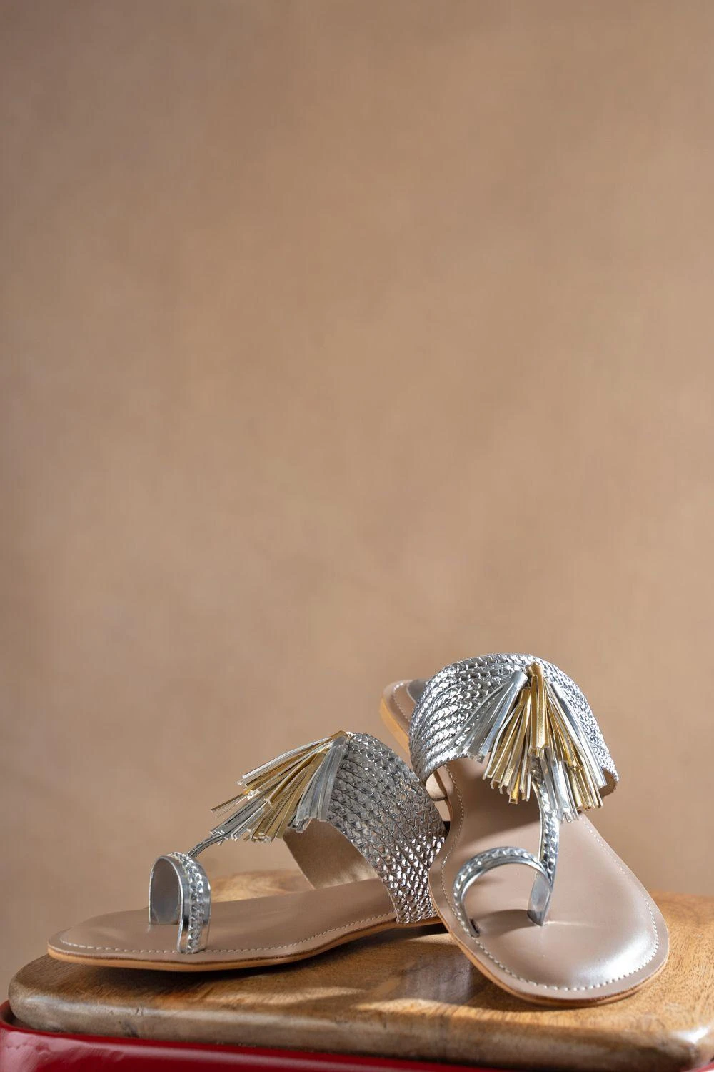 Elevate your style with these Silver and Gold Tassel Braid Flats. These flats are a masterpiece of craftsmanship, featuring intricate braid detailing and elegant tassels.