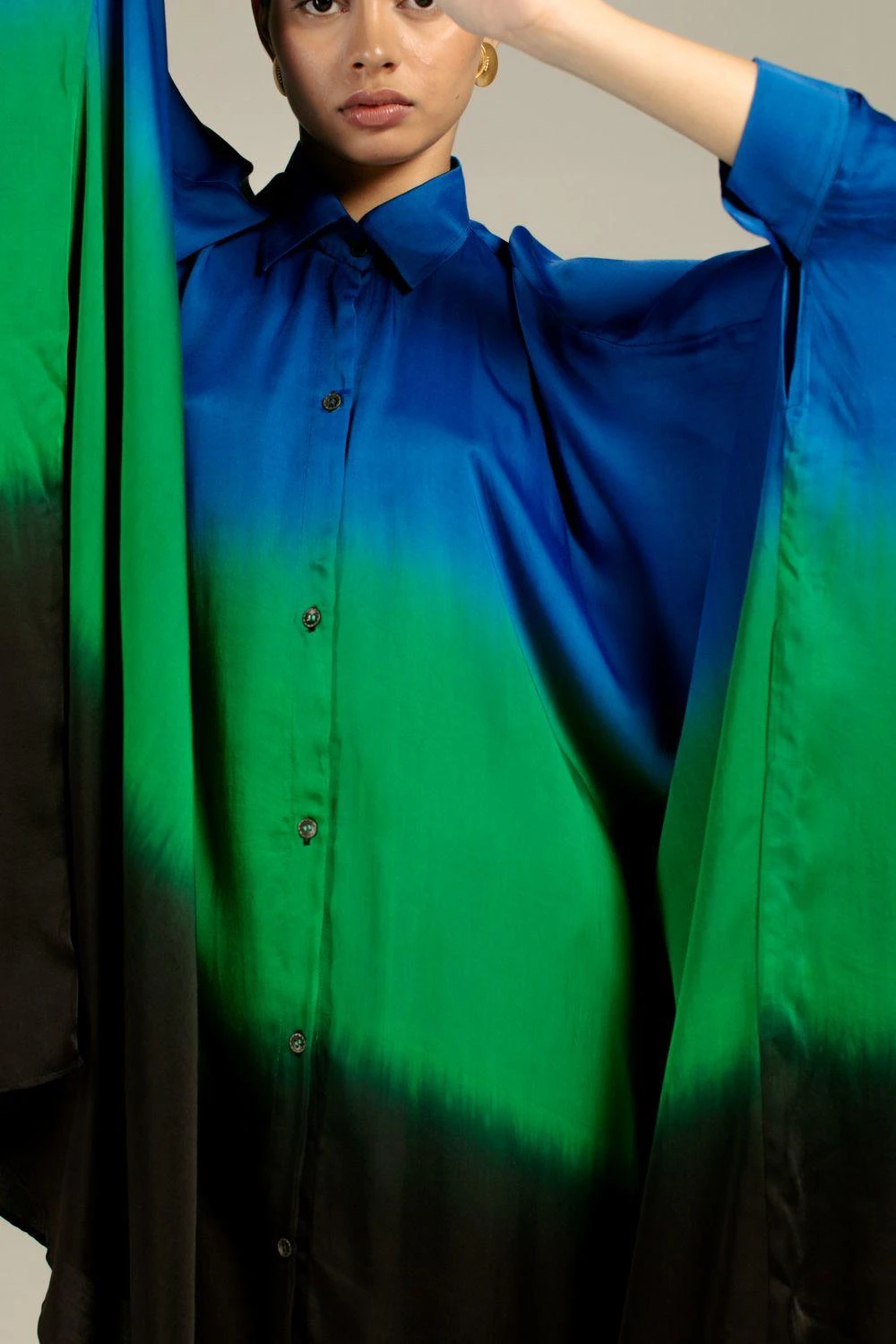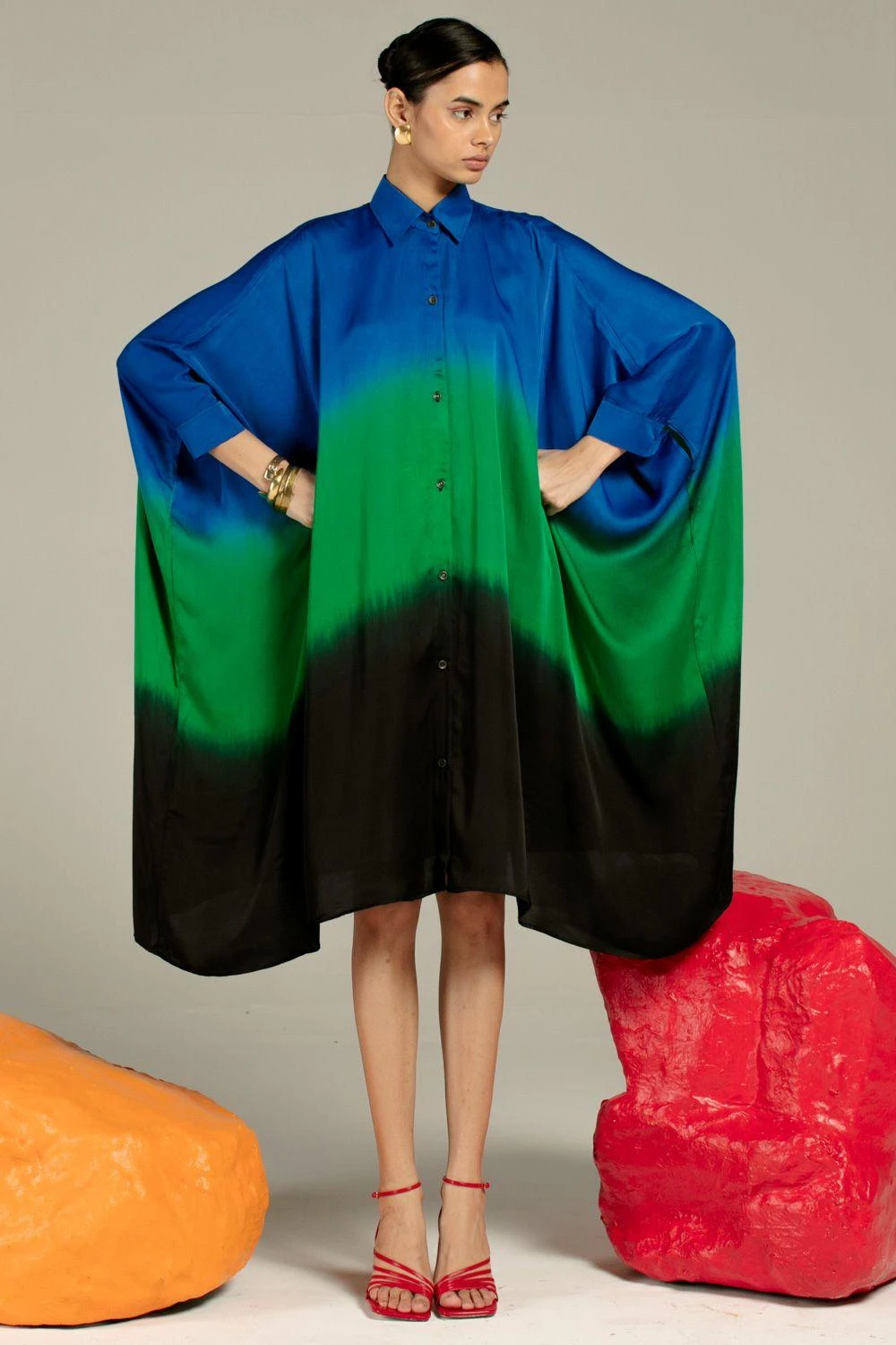This opulent leheriya kimono dress is carefully crafted in vegan silk. This trans seasonal piece is made in three elegant colours. It features an asymmetric hem & breezy kimono sleeves. Add a pair of statement earrings with this look.