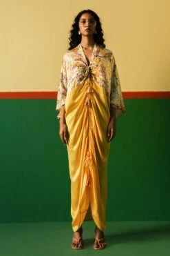 Cut in marble like Mayfair printed vegan silk, this draped & adjustable Mayfair kaftan has kimono sleeves and features ruch detailing from to bottom. The perfect transitional piece to go from day to evening in style & comfort.