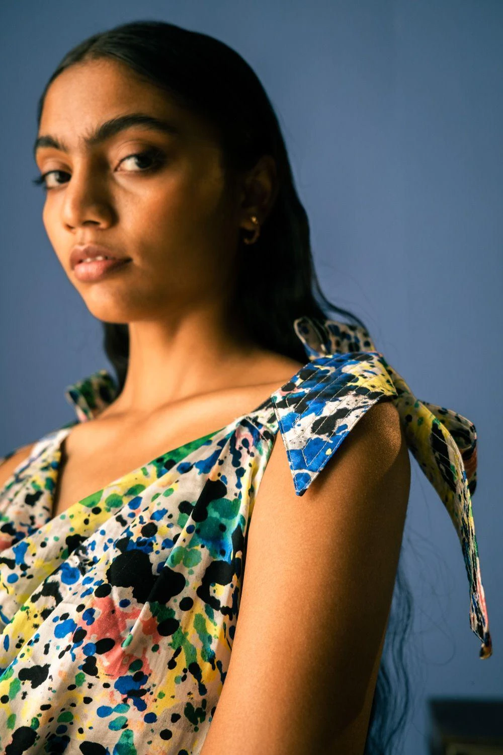 Studio Rigu makes the most of the season with breezy prints & flattering silhouettes like this strappy dress. It is consciously made in vegan silk with abstract splatter prints, making it one of a kind. Style it with a pair of statement earrings.