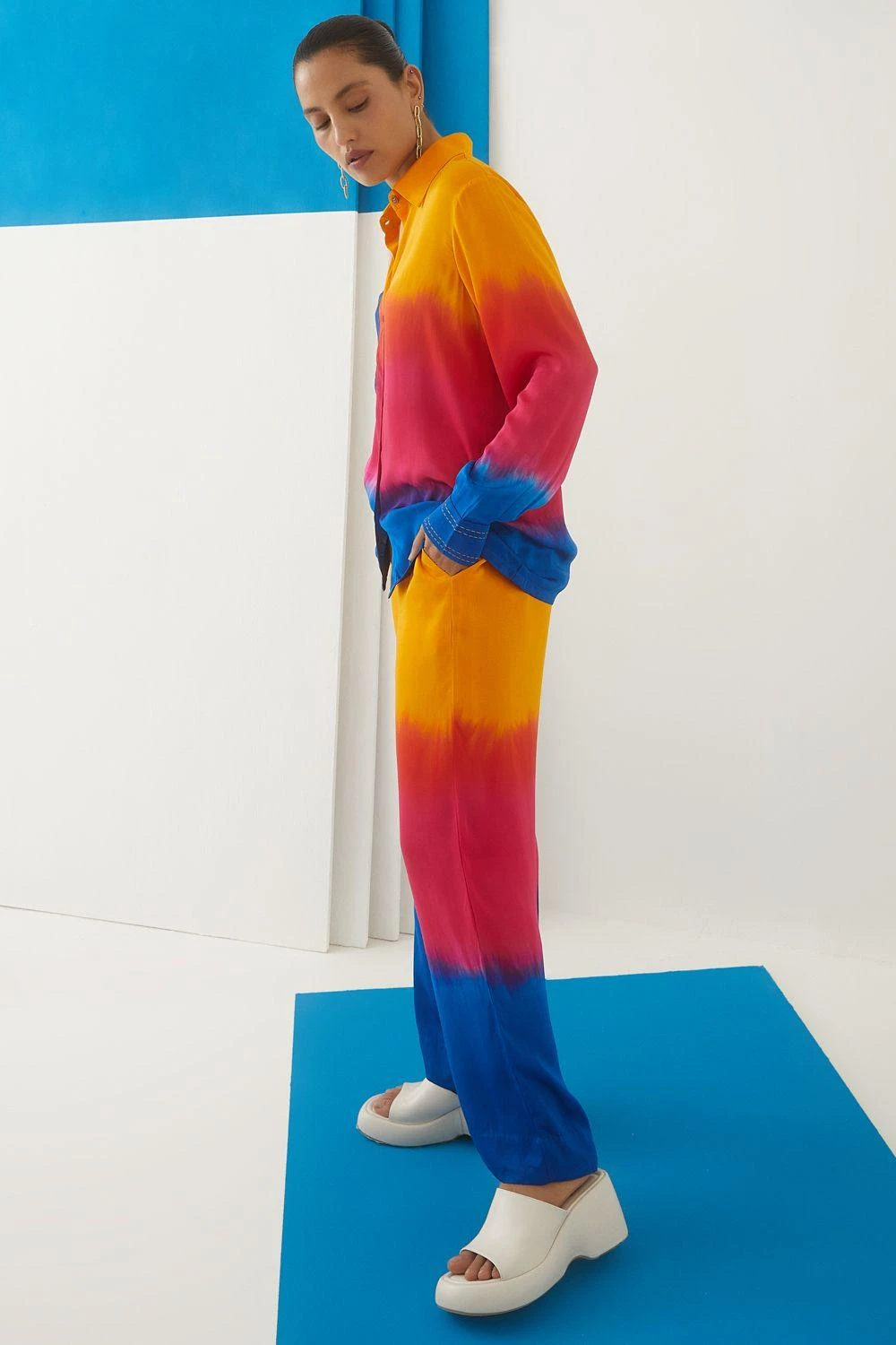 The perfect amalgamation of style & comfort this co-ord set is a must have for your closet. Crafted in vegan silk, this set features a buttoned down ombre shirt in three elegant shades paired with straight fit pants.