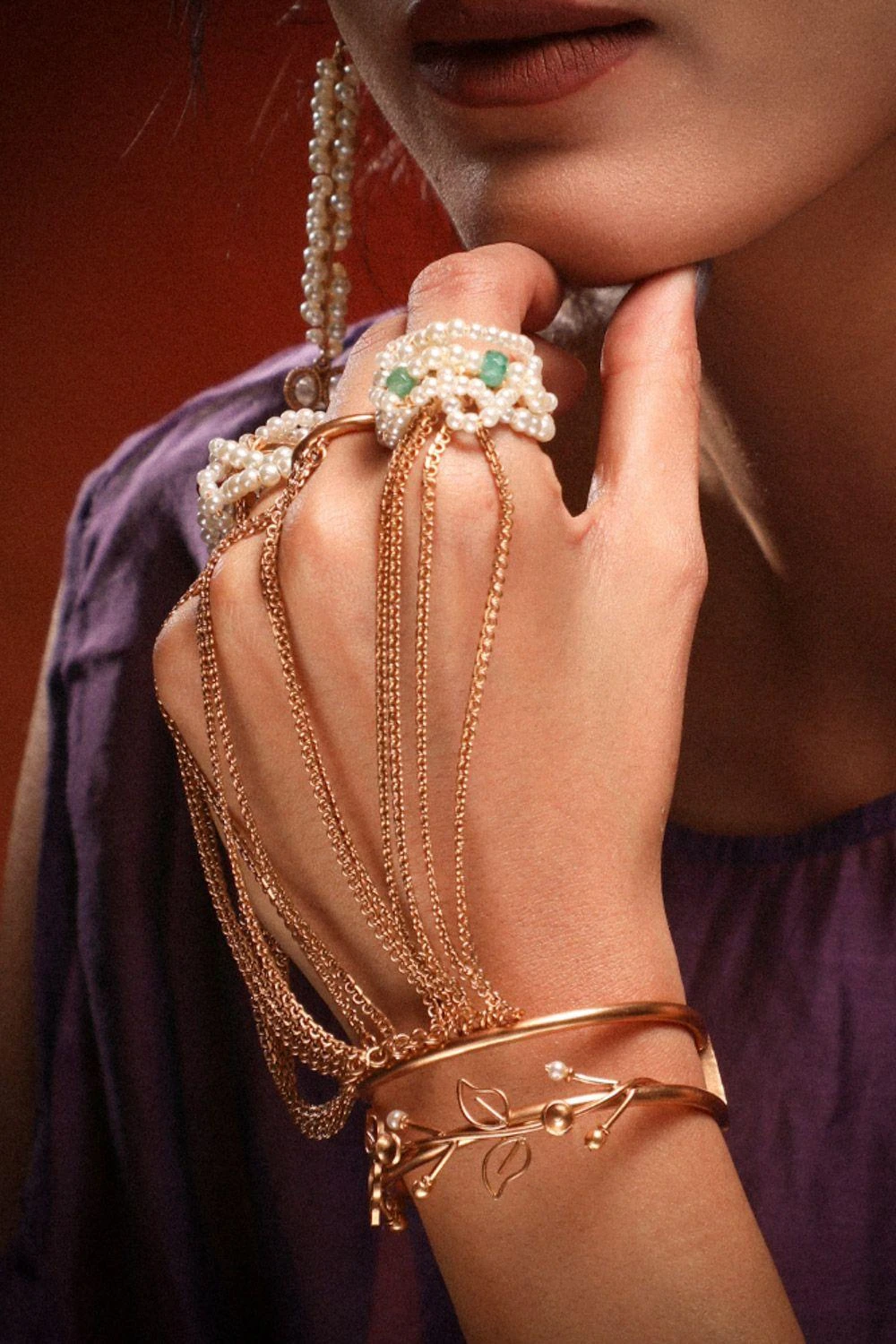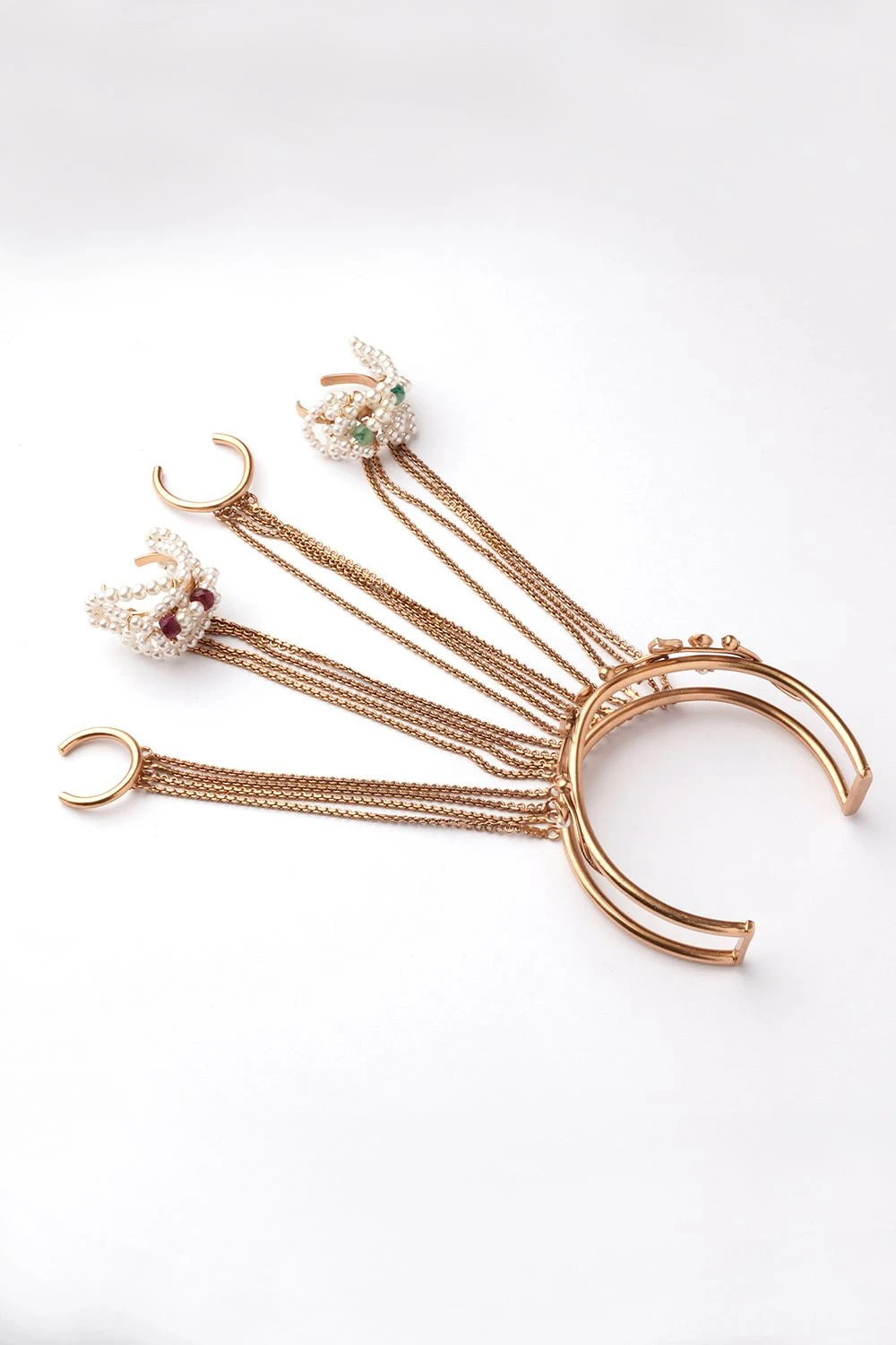 Adorn your hands with the Pearl & Leaf Vine Haath Phool. A symphony of pearls, rubies, and emeralds dances along delicate, lightweight links, embodying grace and opulence.