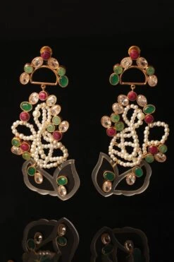 Elevate allure with these enchanting 22K gold plated earrings. The unique black acrylic beads cradle a mesmerizing blend of rubies, emeralds, crystals & pearls. Embrace elegance with this stunning accessory, a captivating tale of luxury & refinement.