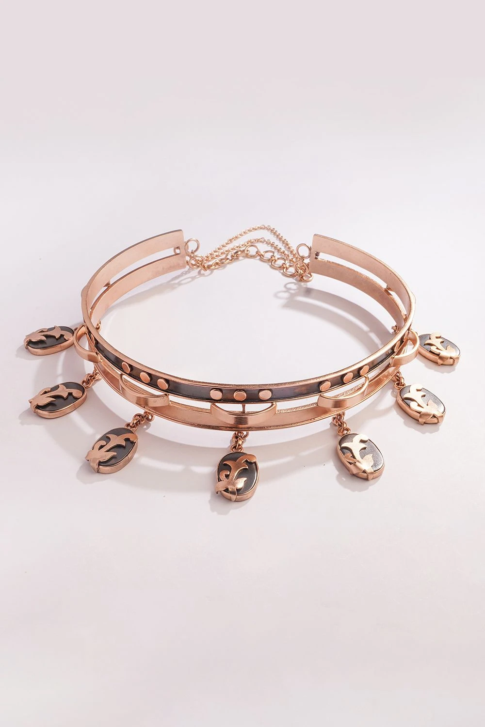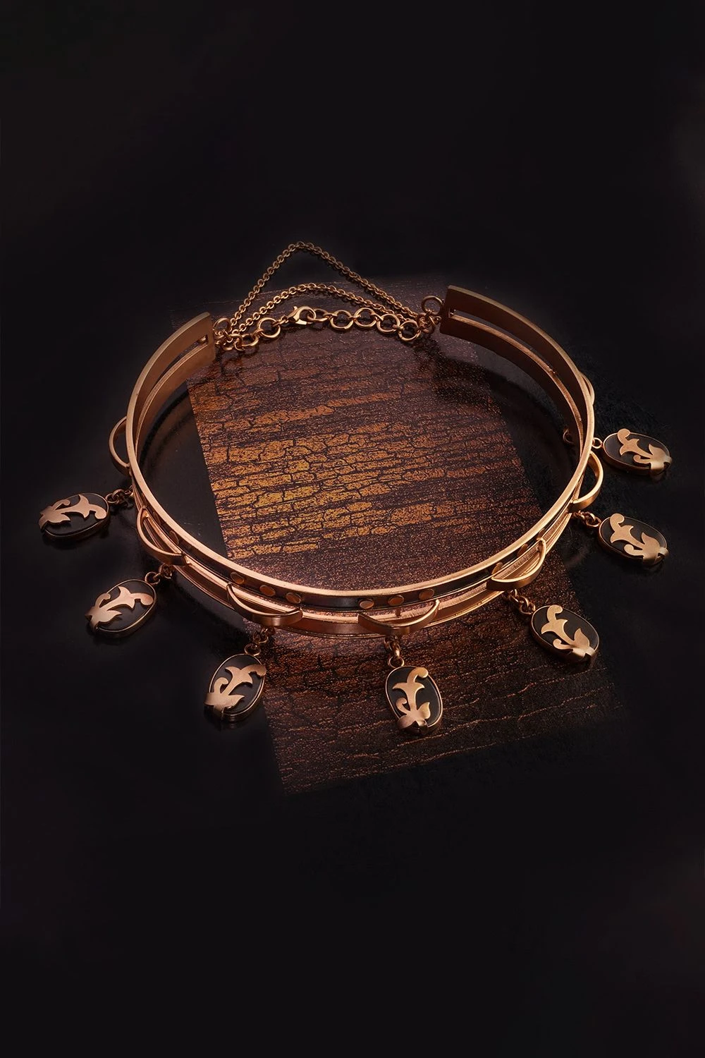 Discover endless elegance with the innovative black and gold choker necklace. Crafted in 22K gold plated copper, it offers versatile styling. Attach additional necklaces and chains to personalize your look, extending sophistication and charm.