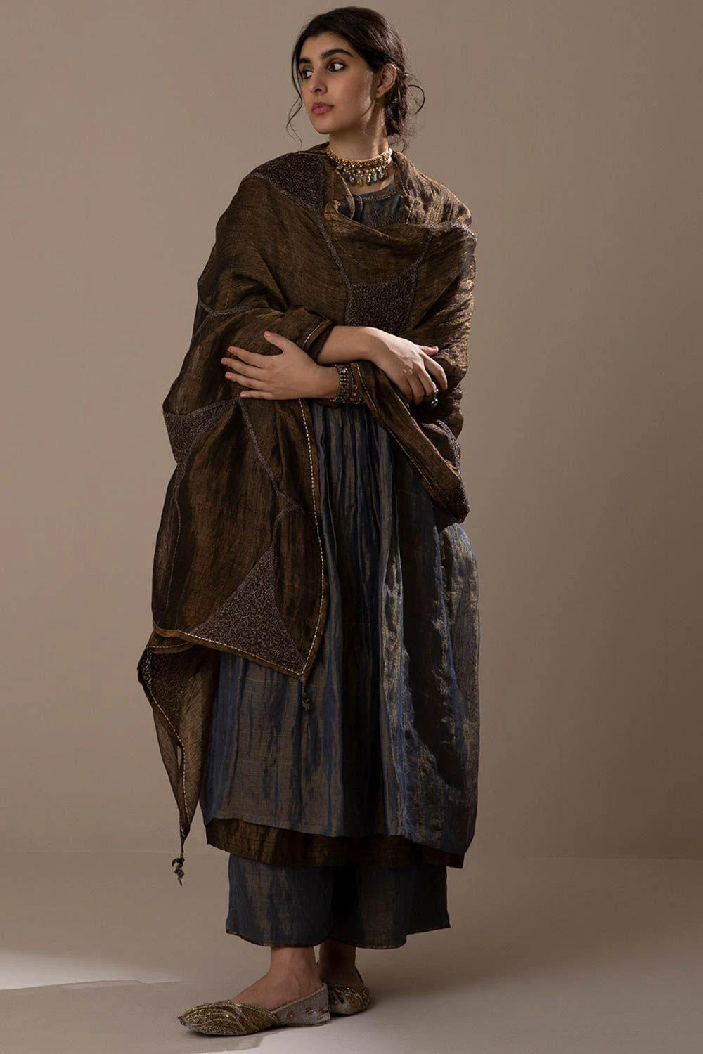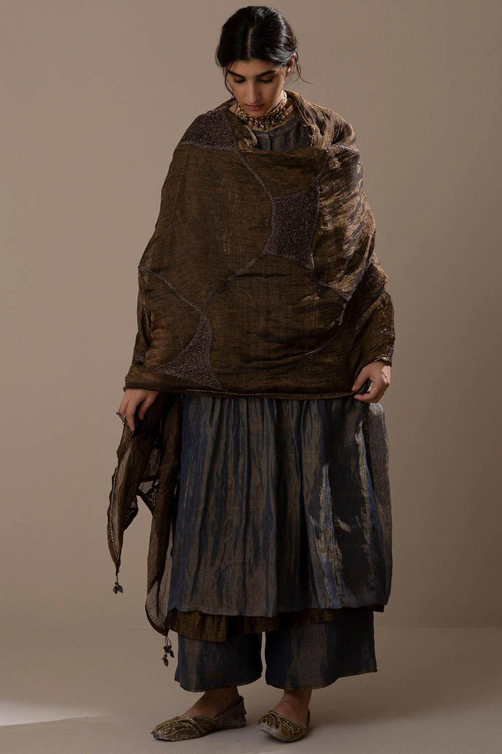 This translucent dupatta is edged and luxuriously finished with contrast linen zari textile and stitch detail in raw textured linen Zari handwoven textile. The monochrome antique nimzari and tilla dori embroidery add a touch of glam to this dupatta.