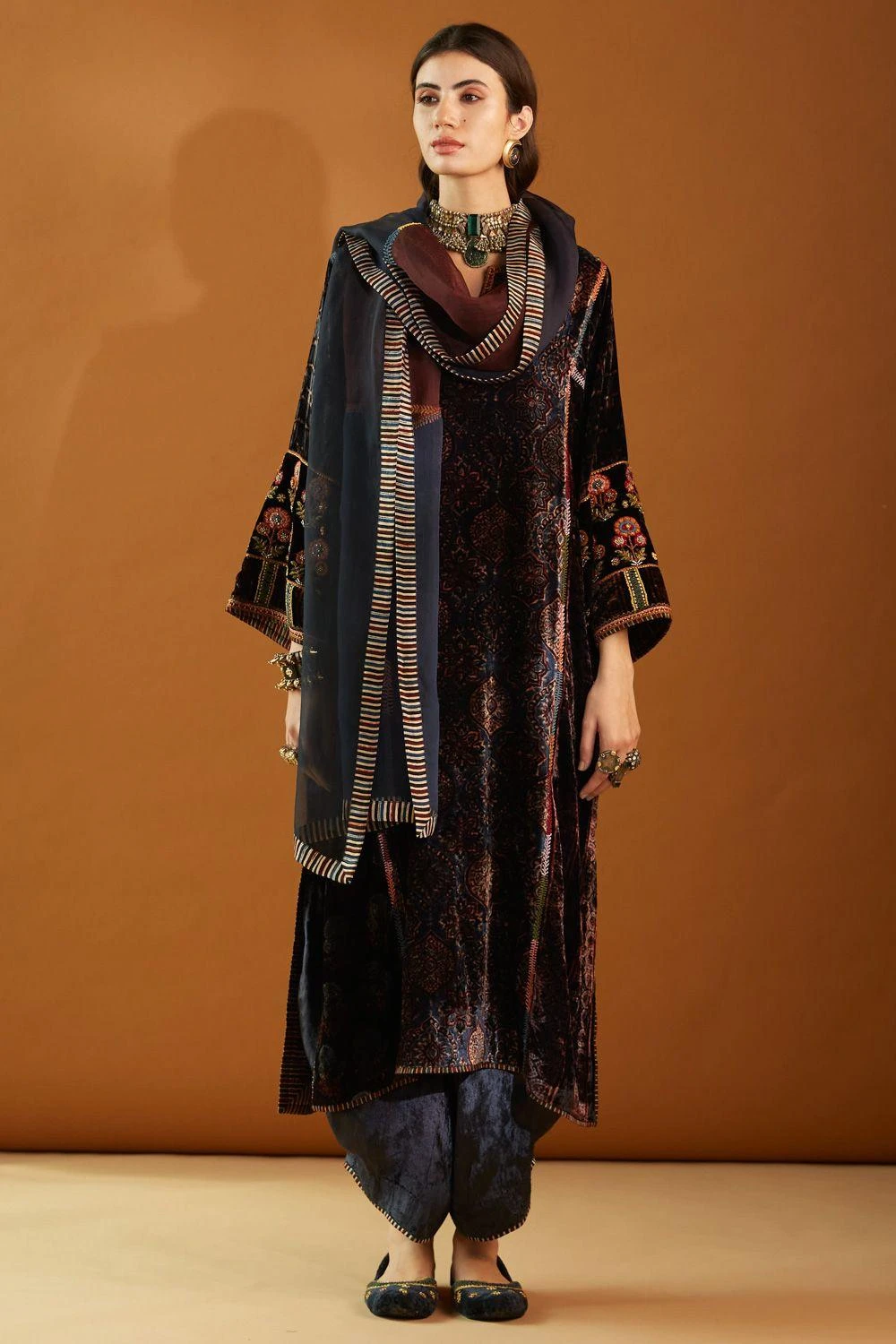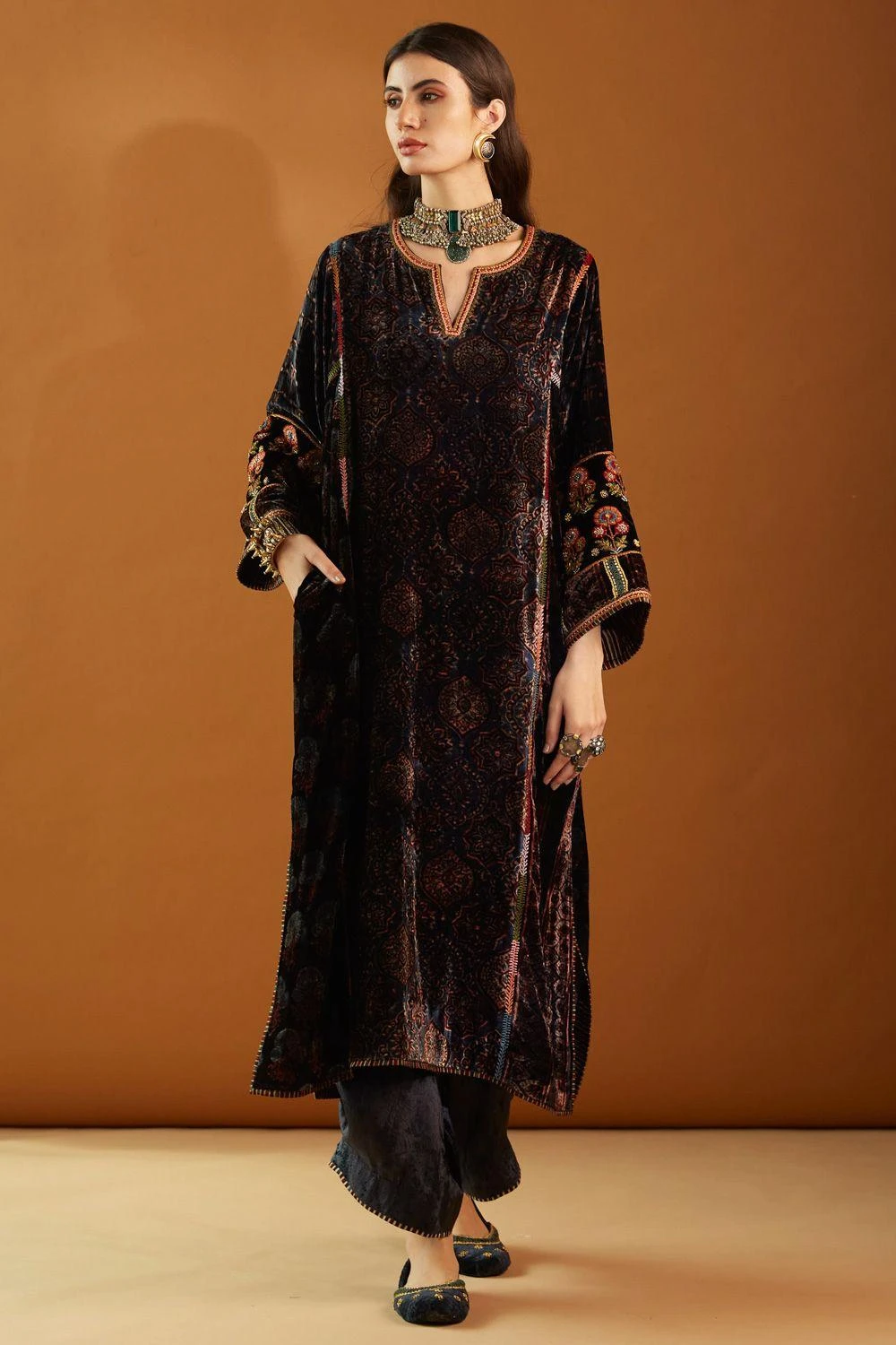 Let loose in comfort & luxury in this black phiran styled panelled kurta. It is crafted in rich ajrakh hand-block printed velvet with mughal motif embroidery details on the panels. Style it with a pair of coordinating pants for an evening festivity.